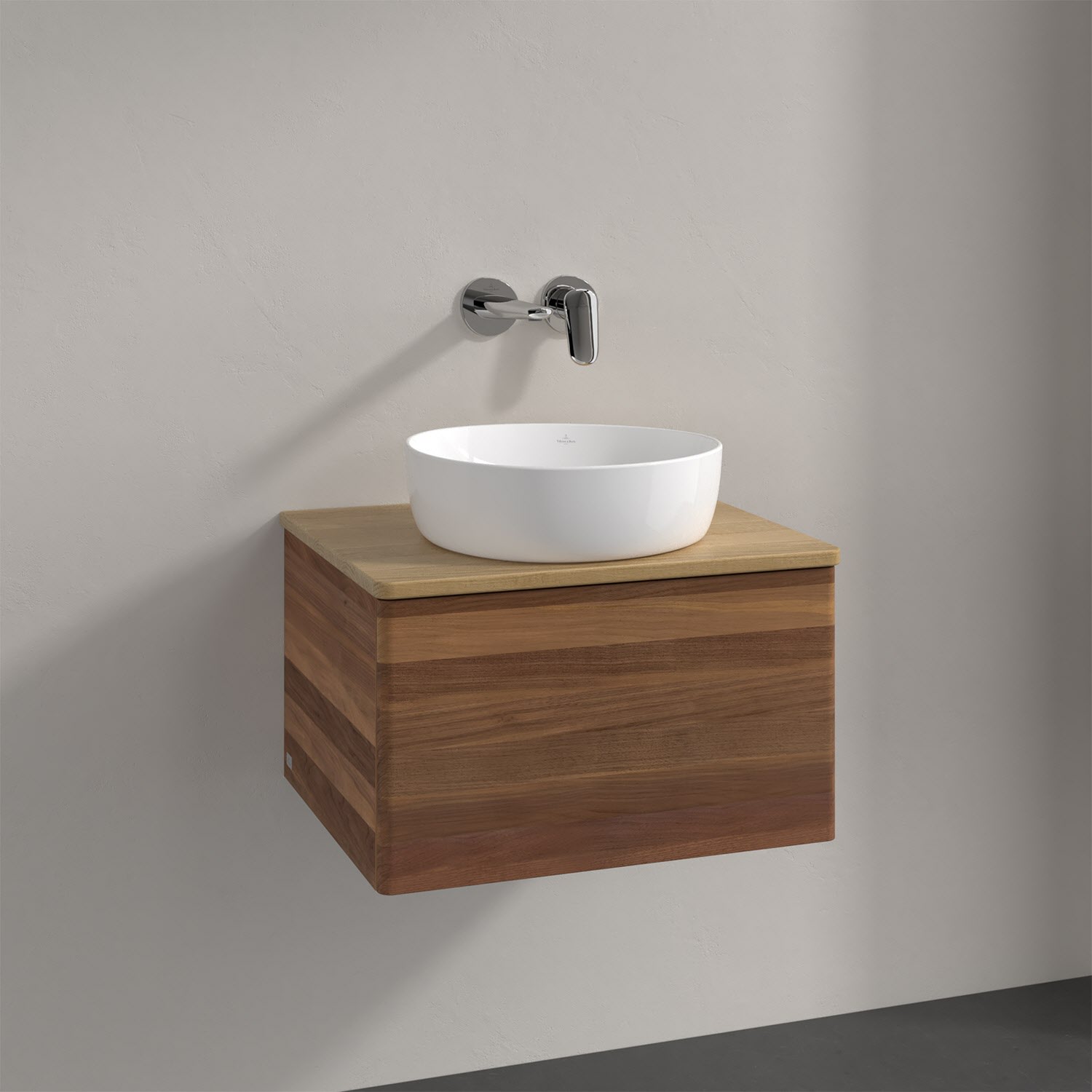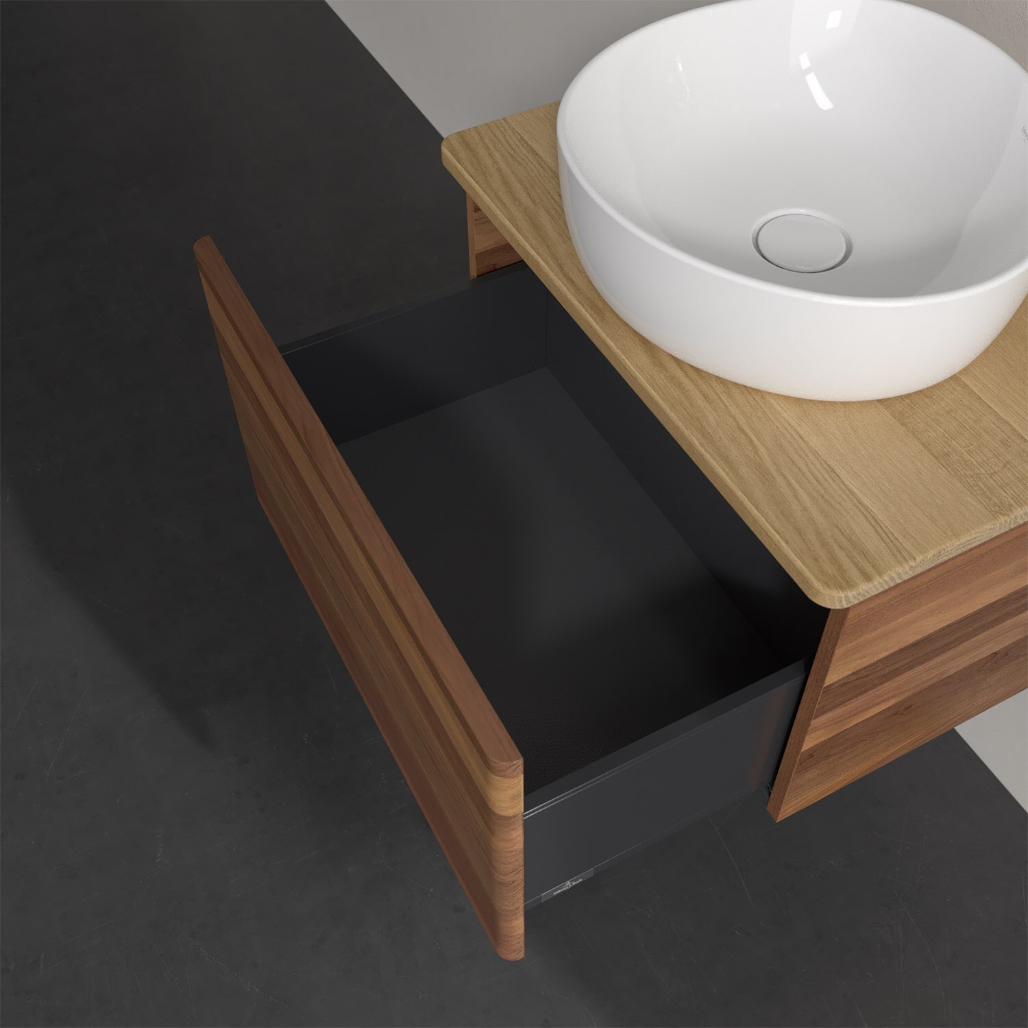 Wenig Platz im Badezimmer und dennoch soll es gemütlich und ordentlich sein? Dann ist der wandhängende Antao Waschtischunterschrank mit seinen sanft abgerundeten Kanten die ideale Lösung. Das geräumige Möbel bietet ausreichend Stauraum für alle nötigen Badutensilien. Zum Öffnen genügt dank der Push-to-Open Funktion ein leichter Druck auf den extra hohen Auszug, der sich dann in seiner vollen Tiefe öffnet. Das garantiert den benötigen Überblick! Praktisch ist auch der integrierte Antirutschboden und die SoftClosing Funktion, die ein Umfallen oder Verrutschen der verstauten Produkte verhindern. Villeroy & Boch hat alles durchdacht! Für eine besonders leichte Pflege sorgt die mehrschichtig deckend lackierte Oberfläche. Bei der Ausführung in Massivholz wird dank des verarbeiteten Massivholzes jedes Möbel zu einem Unikat, das sich durch das lebendige Naturmaterial durch seine einzigartige Struktur und Maserung auszeichnet.
