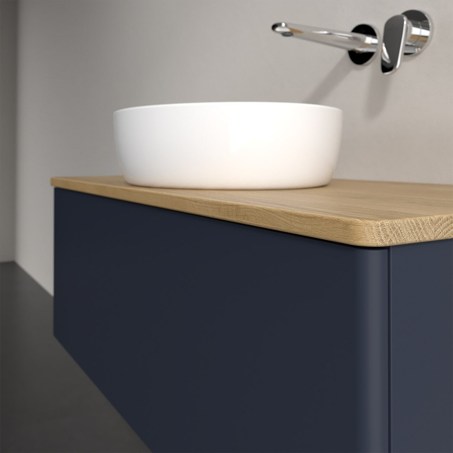 Mit dem wandhängenden Antao Waschtischunterschrank entscheidet man sich für eine hochwertige und praktische Stauraumlösung, die viel Freude bereitet. Die Funktionen sind besonders gut durchdacht: Im Inneren der beiden extra hohen und vollausziehbaren Auszüge können Handtücher, Kosmetik oder andere Pflegeprodukte dank des Antirutschbodens bequem aufbewahrt werden. Geöffnet wird das Möbel durch leichten Druck auf die grifflose Front. Natürlich verfügen die Auszüge über eingebaute Dämpfer, die sie anschließend wieder sanft und leise schließen lassen. Auch auf der Waschtischplatte finden die wichtigsten Utensilien seitlich des Waschtischs genügend Platz. Optisch sorgt der Unterschrank von Villeroy & Boch mit seinen abgerundeten Kanten für ein modernes, gemütliches Ambiente. Für eine besonders leichte Pflege sorgt die mehrschichtig deckend lackierte Oberfläche. Bei der Ausführung in Massivholz wird dank des verarbeiteten Massivholzes jedes Möbel zu einem Unikat, das sich durch das lebendige Naturmaterial durch seine einzigartige Struktur und Maserung auszeichnet.