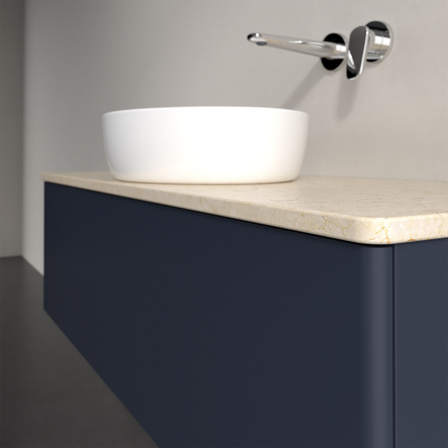 Der wandhängende Antao Waschtischunterschrank von Villeroy & Boch bietet nicht nur jede Menge Stauraum – er ist dank seines naturinspirierten Designs mit seinen abgerundeten Kanten auch noch besonders stilvoll und schafft eine gemütliche Atmosphäre im Badezimmer. Auf der Waschtischplatte bietet sich rechts und links neben dem Waschtisch viel Platz für Zahnbürstenbecher oder Seifenspender. Ein extra hoher Auszug bietet viel Platz, um alles Notwendige zu verstauen und Ordnung zu halten. Öffnen lässt er sich durch leichten Druck auf die grifflose Front. Dank Vollauszug hat man immer alles im Blick und der Antirutschboden verhindert ein Umfallen oder Verrutschen der Gegenstände. Einfach clever! Für eine besonders leichte Pflege sorgt die mehrschichtig deckend lackierte Oberfläche. Bei der Ausführung in Massivholz wird dank des verarbeiteten Massivholzes jedes Möbel zu einem Unikat, das sich durch das lebendige Naturmaterial durch seine einzigartige Struktur und Maserung auszeichnet.