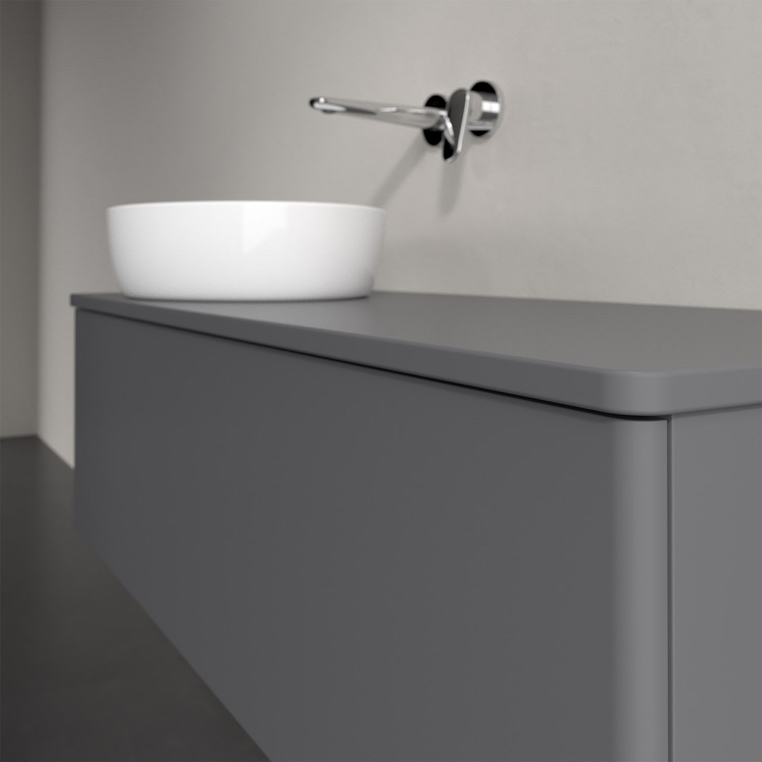 Der wandhängende Antao Waschtischunterschrank von Villeroy & Boch bietet nicht nur jede Menge Stauraum – er ist dank seines naturinspirierten Designs mit seinen abgerundeten Kanten auch noch besonders stilvoll und schafft eine gemütliche Atmosphäre im Badezimmer. Auf der Waschtischplatte bietet sich seitlich des Waschtischs viel Platz für Zahnbürstenbecher oder Seifenspender. Ein extra hoher Auszug bietet viel Platz, um alles Notwendige zu verstauen und Ordnung zu halten. Öffnen lässt er sich durch leichten Druck auf die grifflose Front. Dank Vollauszug hat man immer alles im Blick und der Antirutschboden verhindert ein Umfallen oder Verrutschen der Gegenstände. Einfach clever! Für eine besonders leichte Pflege sorgt die mehrschichtig deckend lackierte Oberfläche.