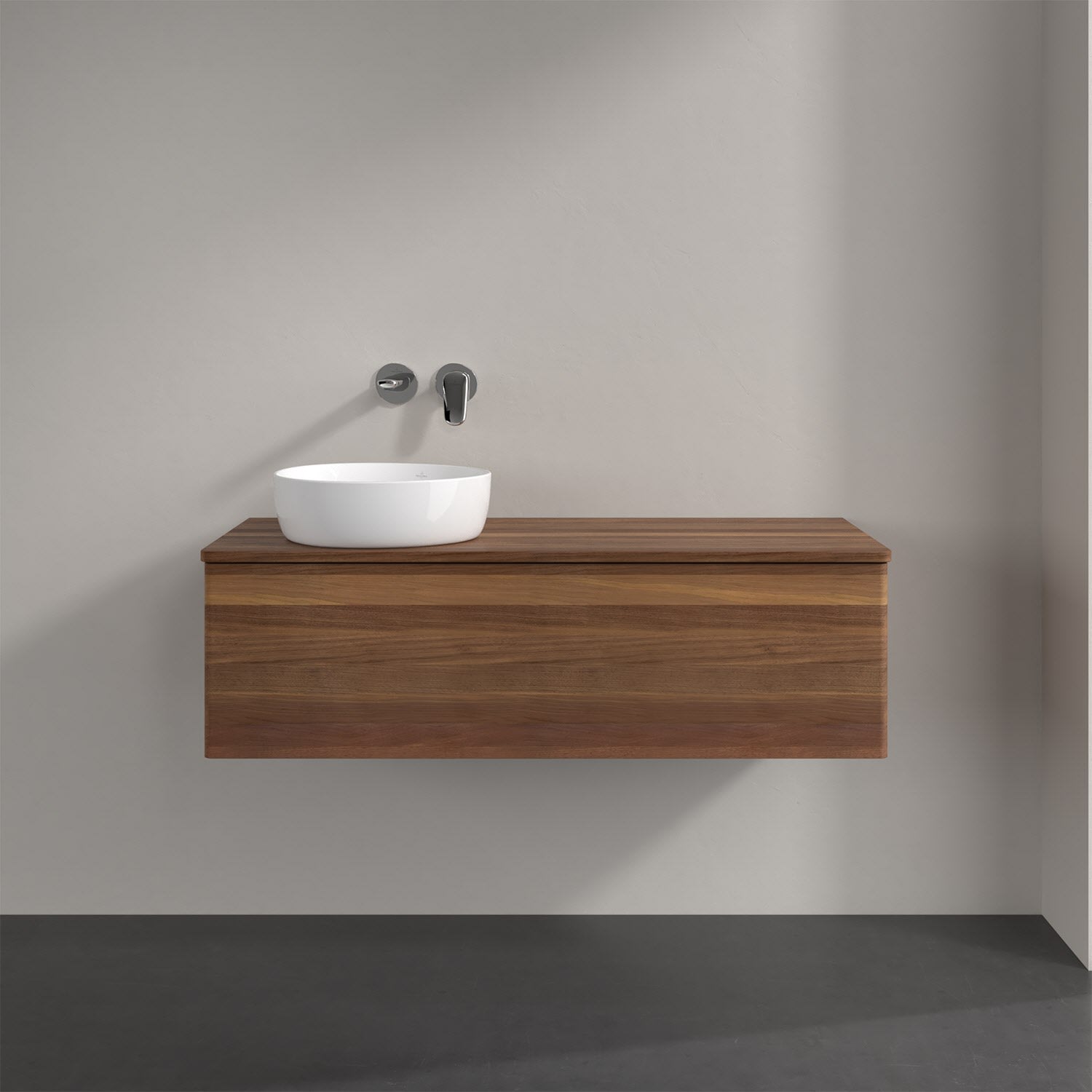 Für diesen Waschbeckenunterschrank stehen Ihnen Aufsatzwaschtische aus verschiedenen Serien zur Verfügung (siehe "Passliste" unter Downloads). Ein ausgewähltes Beispiel finden Sie im Zubehör. Den Waschtisch bitte separat mitbestellen.
