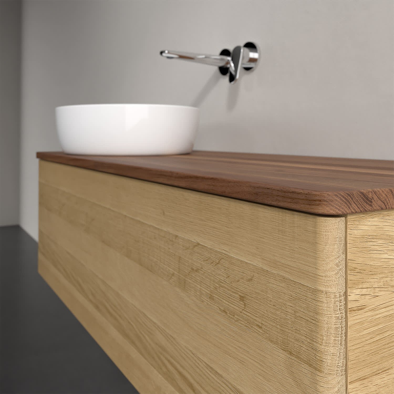 Der wandhängende Antao Waschtischunterschrank von Villeroy & Boch bietet nicht nur jede Menge Stauraum – er ist dank seines naturinspirierten Designs mit seinen abgerundeten Kanten auch noch besonders stilvoll und schafft eine gemütliche Atmosphäre im Badezimmer. Auf der Waschtischplatte bietet sich seitlich des Waschtischs viel Platz für Zahnbürstenbecher oder Seifenspender. Ein extra hoher Auszug bietet viel Platz, um alles Notwendige zu verstauen und Ordnung zu halten. Öffnen lässt er sich durch leichten Druck auf die grifflose Front. Dank Vollauszug hat man immer alles im Blick und der Antirutschboden verhindert ein Umfallen oder Verrutschen der Gegenstände. Einfach clever! Für eine besonders leichte Pflege sorgt die mehrschichtig deckend lackierte Oberfläche. Bei der Ausführung in Massivholz wird dank des verarbeiteten Massivholzes jedes Möbel zu einem Unikat, das sich durch das lebendige Naturmaterial durch seine einzigartige Struktur und Maserung auszeichnet.