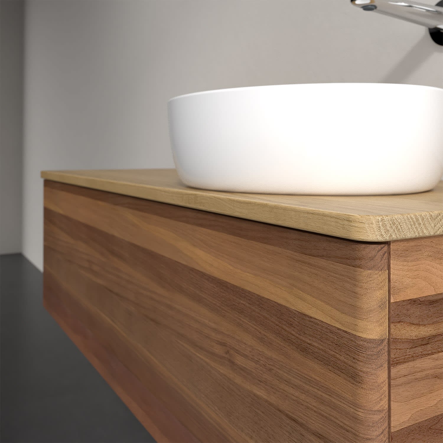 Der wandhängende Antao Waschtischunterschrank von Villeroy & Boch bietet nicht nur jede Menge Stauraum – er ist dank seines naturinspirierten Designs mit seinen abgerundeten Kanten auch noch besonders stilvoll und schafft eine gemütliche Atmosphäre im Badezimmer. Auf der Waschtischplatte bietet sich seitlich des Waschtischs viel Platz für Zahnbürstenbecher oder Seifenspender. Ein extra hoher Auszug bietet viel Platz, um alles Notwendige zu verstauen und Ordnung zu halten. Öffnen lässt er sich durch leichten Druck auf die grifflose Front. Dank Vollauszug hat man immer alles im Blick und der Antirutschboden verhindert ein Umfallen oder Verrutschen der Gegenstände. Einfach clever! Für eine besonders leichte Pflege sorgt die mehrschichtig deckend lackierte Oberfläche. Bei der Ausführung in Massivholz wird dank des verarbeiteten Massivholzes jedes Möbel zu einem Unikat, das sich durch das lebendige Naturmaterial durch seine einzigartige Struktur und Maserung auszeichnet.