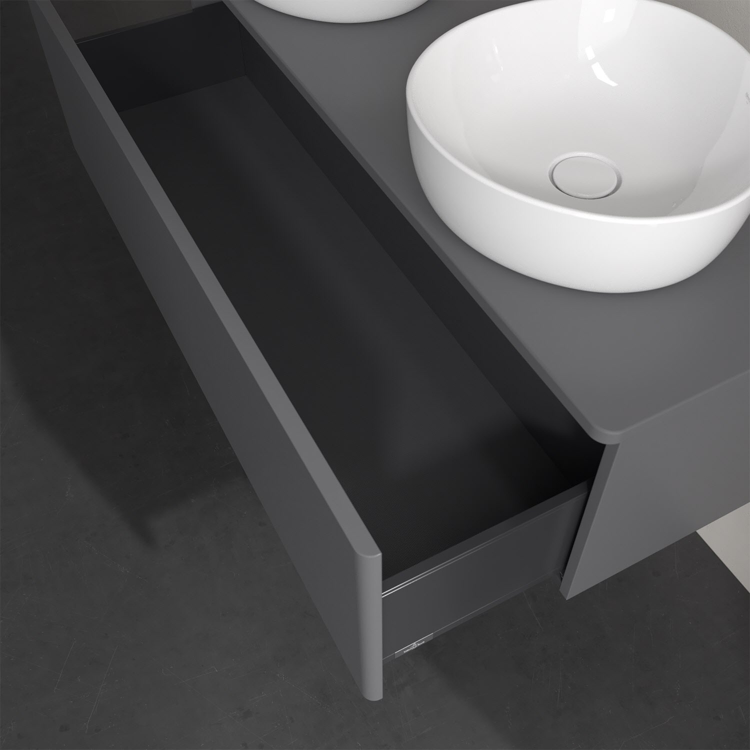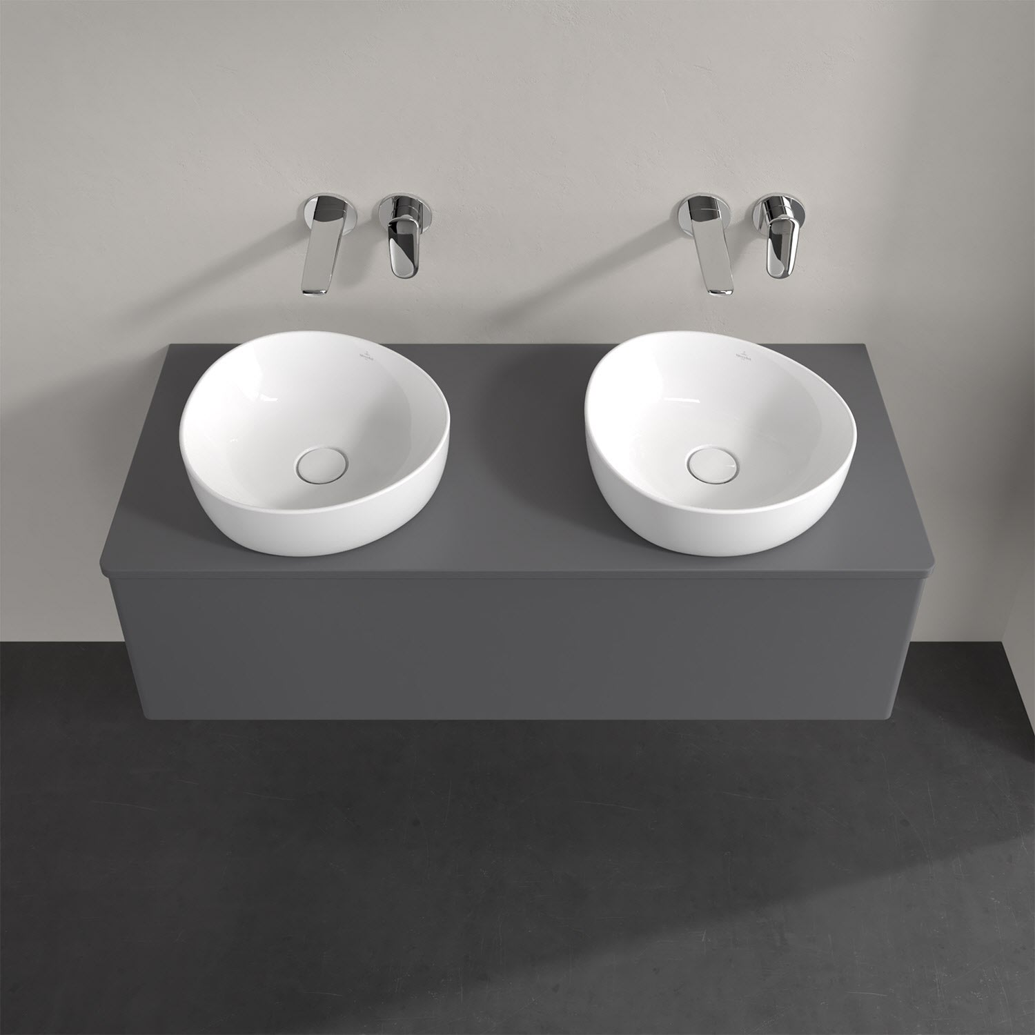 Der wandhängende Antao Waschtischunterschrank von Villeroy & Boch bietet nicht nur jede Menge Stauraum – er ist dank seines naturinspirierten Designs mit seinen abgerundeten Kanten auch noch besonders stilvoll und schafft eine gemütliche Atmosphäre im Badezimmer. Kombiniert mit zwei passenden Aufsatzwaschtischen also die ideale Wahl. Ein extra hoher Auszug bietet viel Platz, um alles Notwendige zu verstauen und Ordnung zu halten. Öffnen lässt er sich durch leichten Druck auf die grifflose Front. Dank Vollauszug hat man immer alles im Blick und der Antirutschboden verhindert ein Umfallen oder Verrutschen der Gegenstände. Einfach clever! Für eine besonders leichte Pflege sorgt die mehrschichtig deckend lackierte Oberfläche.
