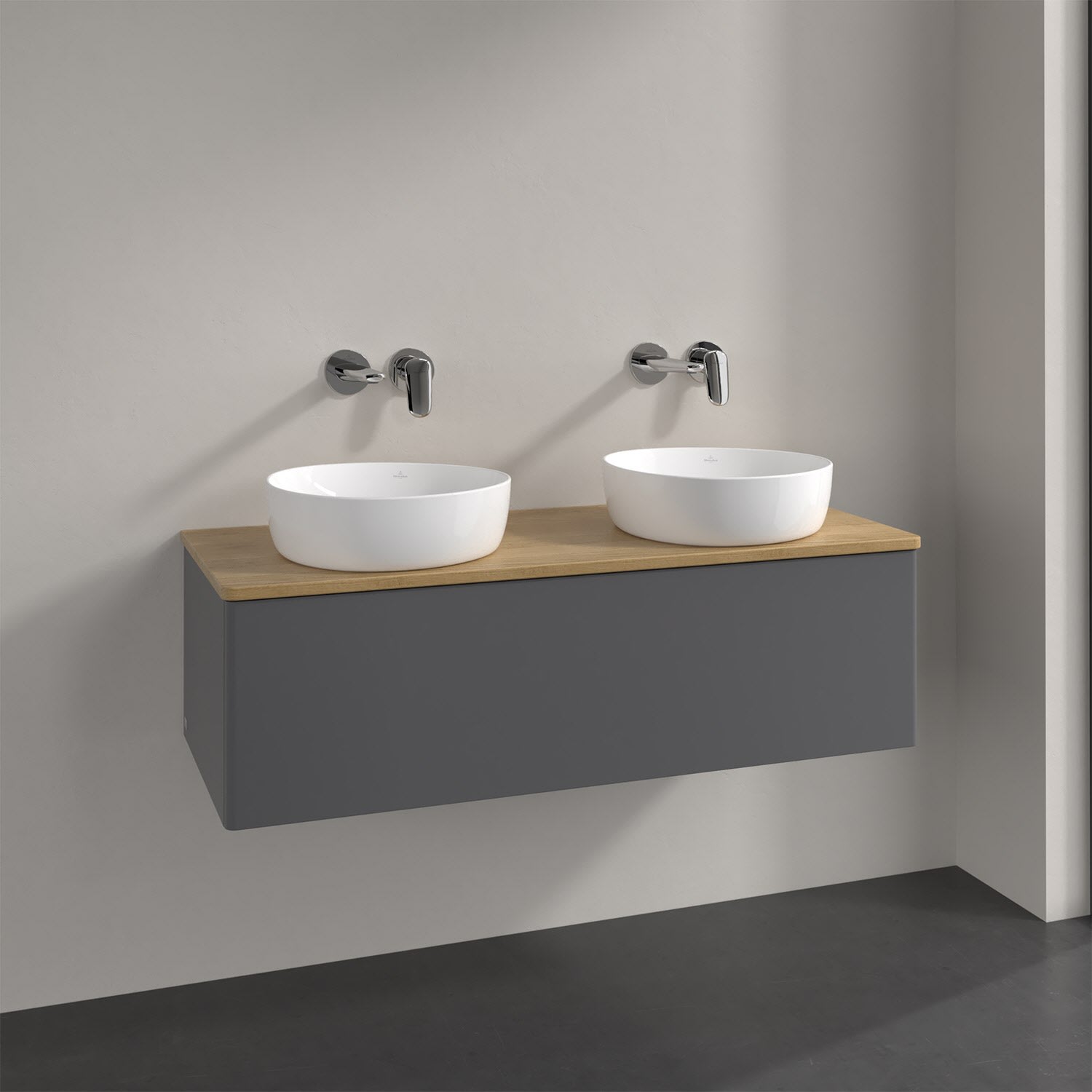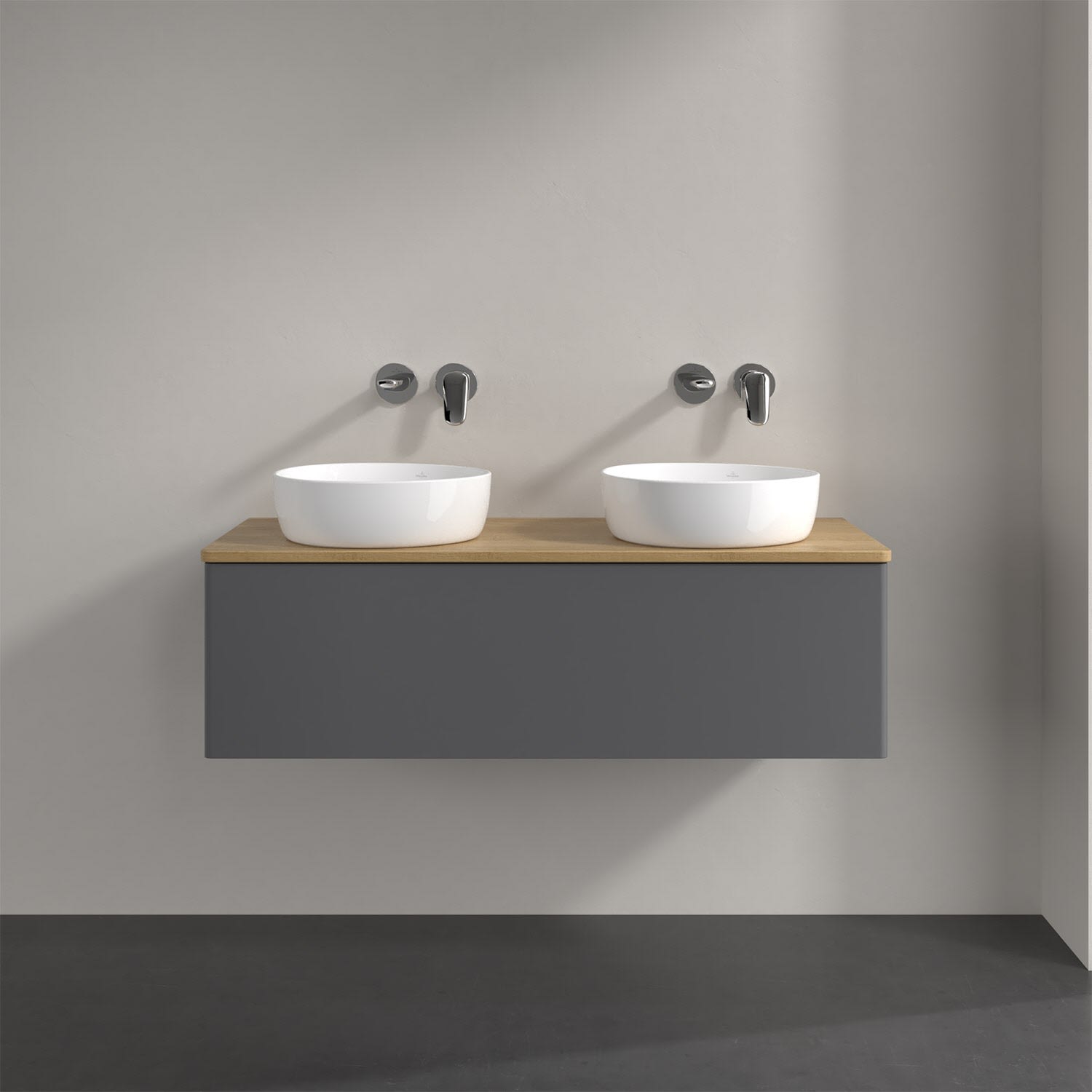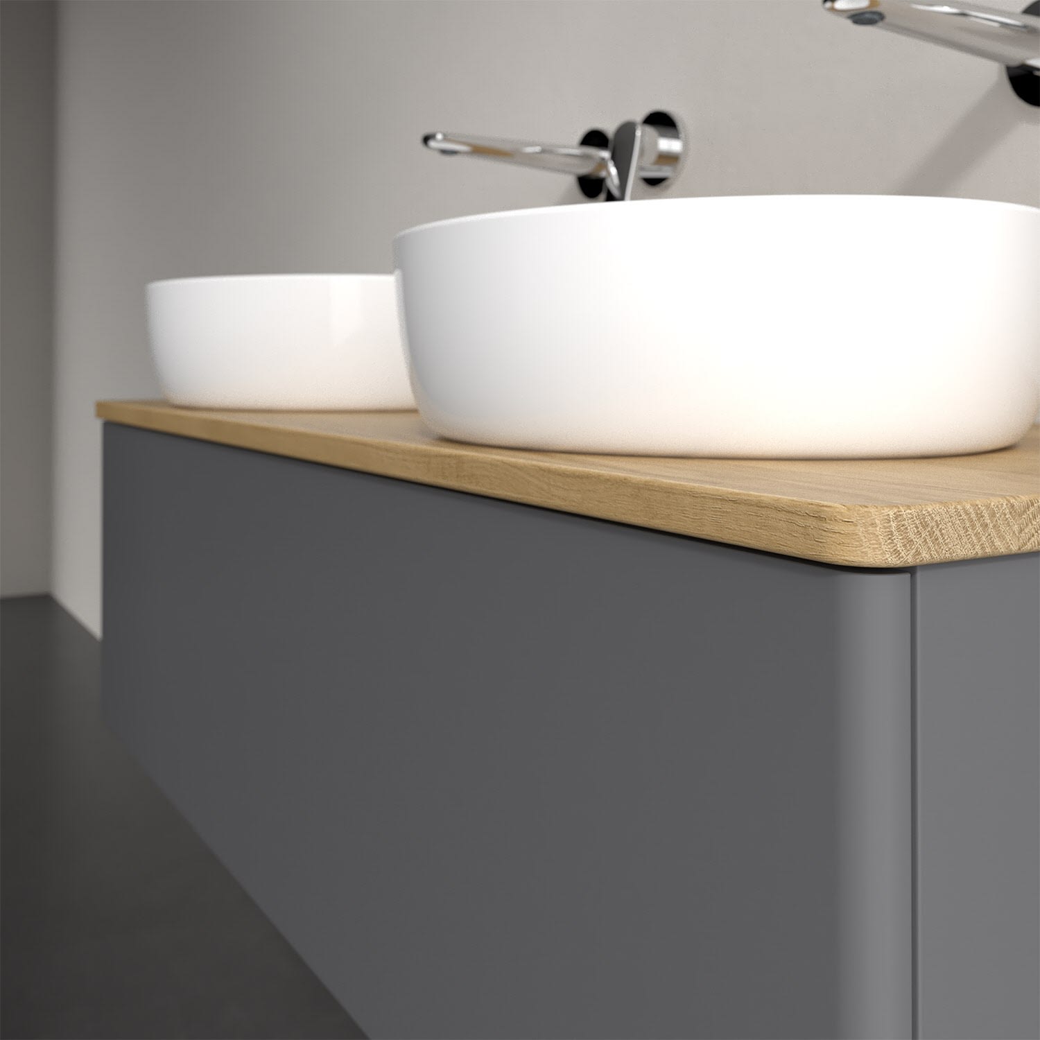 Der wandhängende Antao Waschtischunterschrank von Villeroy & Boch bietet nicht nur jede Menge Stauraum – er ist dank seines naturinspirierten Designs mit seinen abgerundeten Kanten auch noch besonders stilvoll und schafft eine gemütliche Atmosphäre im Badezimmer. Kombiniert mit zwei passenden Aufsatzwaschtischen also die ideale Wahl. Ein extra hoher Auszug bietet viel Platz, um alles Notwendige zu verstauen und Ordnung zu halten. Öffnen lässt er sich durch leichten Druck auf die grifflose Front. Dank Vollauszug hat man immer alles im Blick und der Antirutschboden verhindert ein Umfallen oder Verrutschen der Gegenstände. Einfach clever! Für eine besonders leichte Pflege sorgt die mehrschichtig deckend lackierte Oberfläche. Bei der Ausführung in Massivholz wird dank des verarbeiteten Massivholzes jedes Möbel zu einem Unikat, das sich durch das lebendige Naturmaterial durch seine einzigartige Struktur und Maserung auszeichnet.