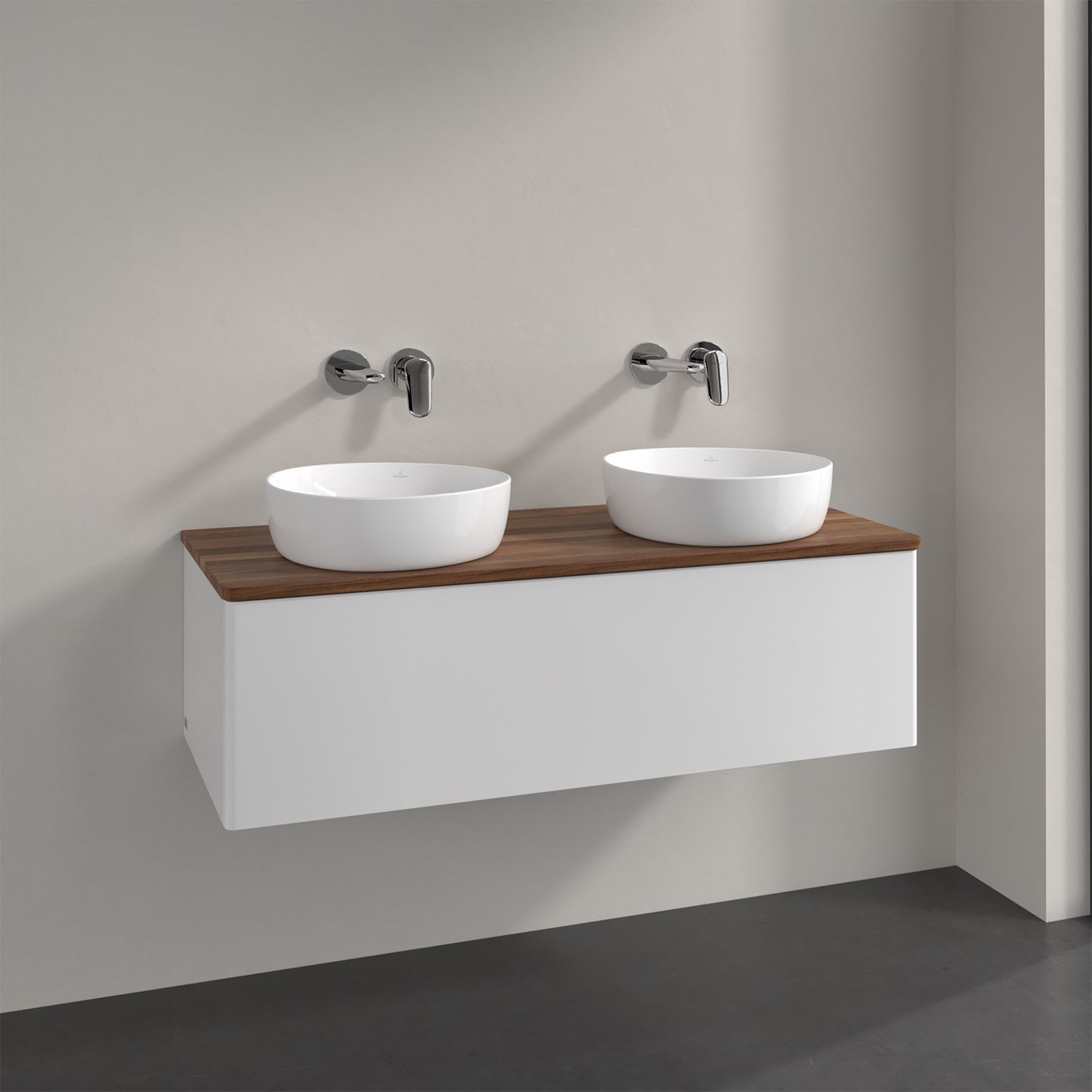 Der wandhängende Antao Waschtischunterschrank von Villeroy & Boch bietet nicht nur jede Menge Stauraum – er ist dank seines naturinspirierten Designs mit seinen abgerundeten Kanten auch noch besonders stilvoll und schafft eine gemütliche Atmosphäre im Badezimmer. Kombiniert mit zwei passenden Aufsatzwaschtischen also die ideale Wahl. Ein extra hoher Auszug bietet viel Platz, um alles Notwendige zu verstauen und Ordnung zu halten. Öffnen lässt er sich durch leichten Druck auf die grifflose Front. Dank Vollauszug hat man immer alles im Blick und der Antirutschboden verhindert ein Umfallen oder Verrutschen der Gegenstände. Einfach clever! Für eine besonders leichte Pflege sorgt die mehrschichtig deckend lackierte Oberfläche. Bei der Ausführung in Massivholz wird dank des verarbeiteten Massivholzes jedes Möbel zu einem Unikat, das sich durch das lebendige Naturmaterial durch seine einzigartige Struktur und Maserung auszeichnet.