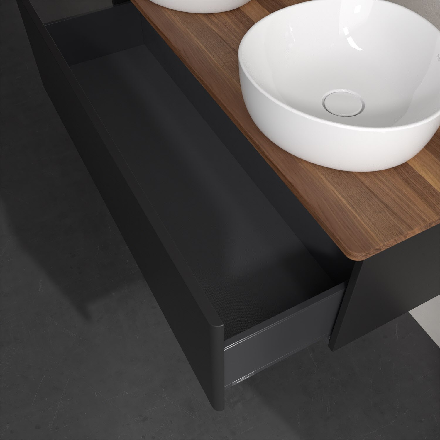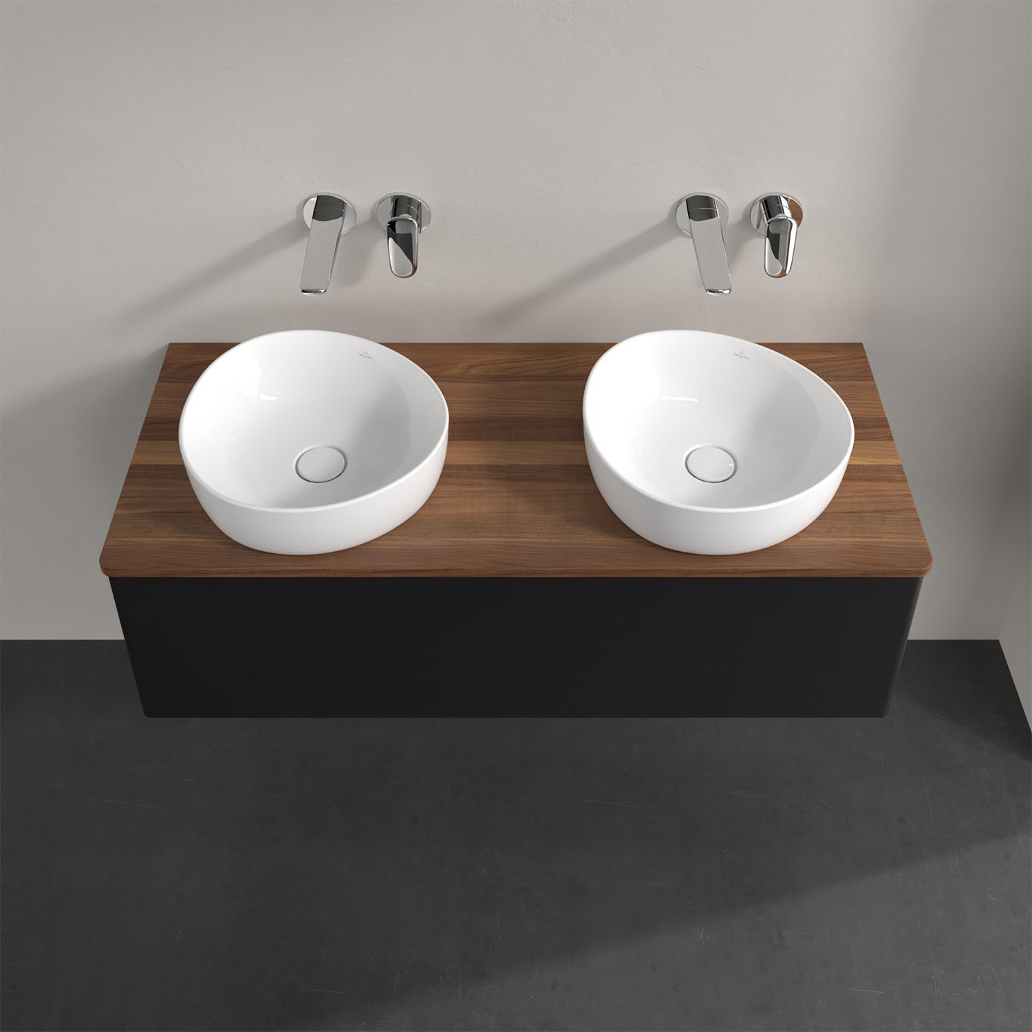 Der wandhängende Antao Waschtischunterschrank von Villeroy & Boch bietet nicht nur jede Menge Stauraum – er ist dank seines naturinspirierten Designs mit seinen abgerundeten Kanten auch noch besonders stilvoll und schafft eine gemütliche Atmosphäre im Badezimmer. Kombiniert mit zwei passenden Aufsatzwaschtischen also die ideale Wahl. Ein extra hoher Auszug bietet viel Platz, um alles Notwendige zu verstauen und Ordnung zu halten. Öffnen lässt er sich durch leichten Druck auf die grifflose Front. Dank Vollauszug hat man immer alles im Blick und der Antirutschboden verhindert ein Umfallen oder Verrutschen der Gegenstände. Einfach clever! Für eine besonders leichte Pflege sorgt die mehrschichtig deckend lackierte Oberfläche. Bei der Ausführung in Massivholz wird dank des verarbeiteten Massivholzes jedes Möbel zu einem Unikat, das sich durch das lebendige Naturmaterial durch seine einzigartige Struktur und Maserung auszeichnet.