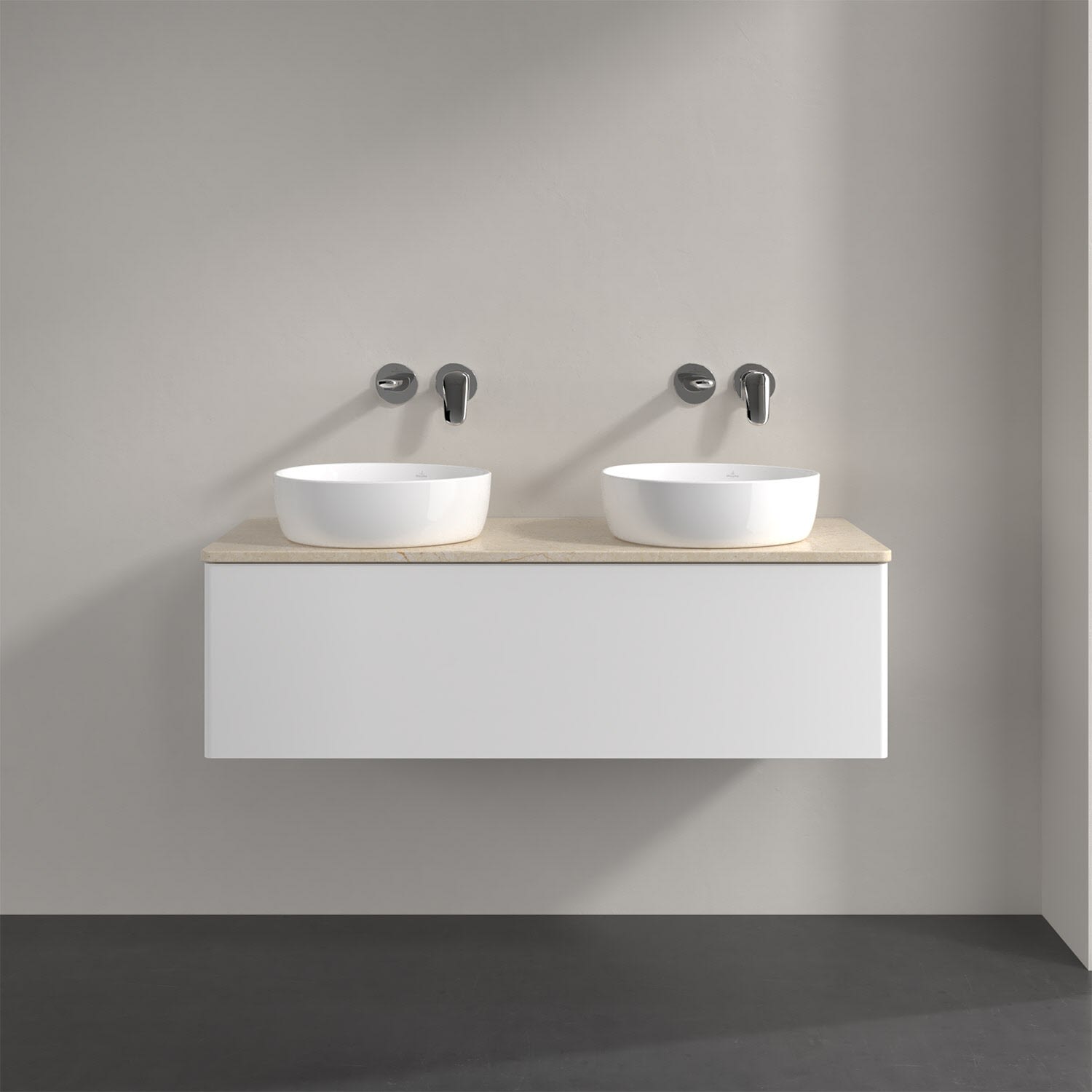 Für diesen Waschbeckenunterschrank stehen Ihnen Aufsatzwaschtische aus verschiedenen Serien zur Verfügung (siehe "Passliste" unter Downloads). Ein ausgewähltes Beispiel finden Sie im Zubehör. Den Waschtisch bitte separat mitbestellen.