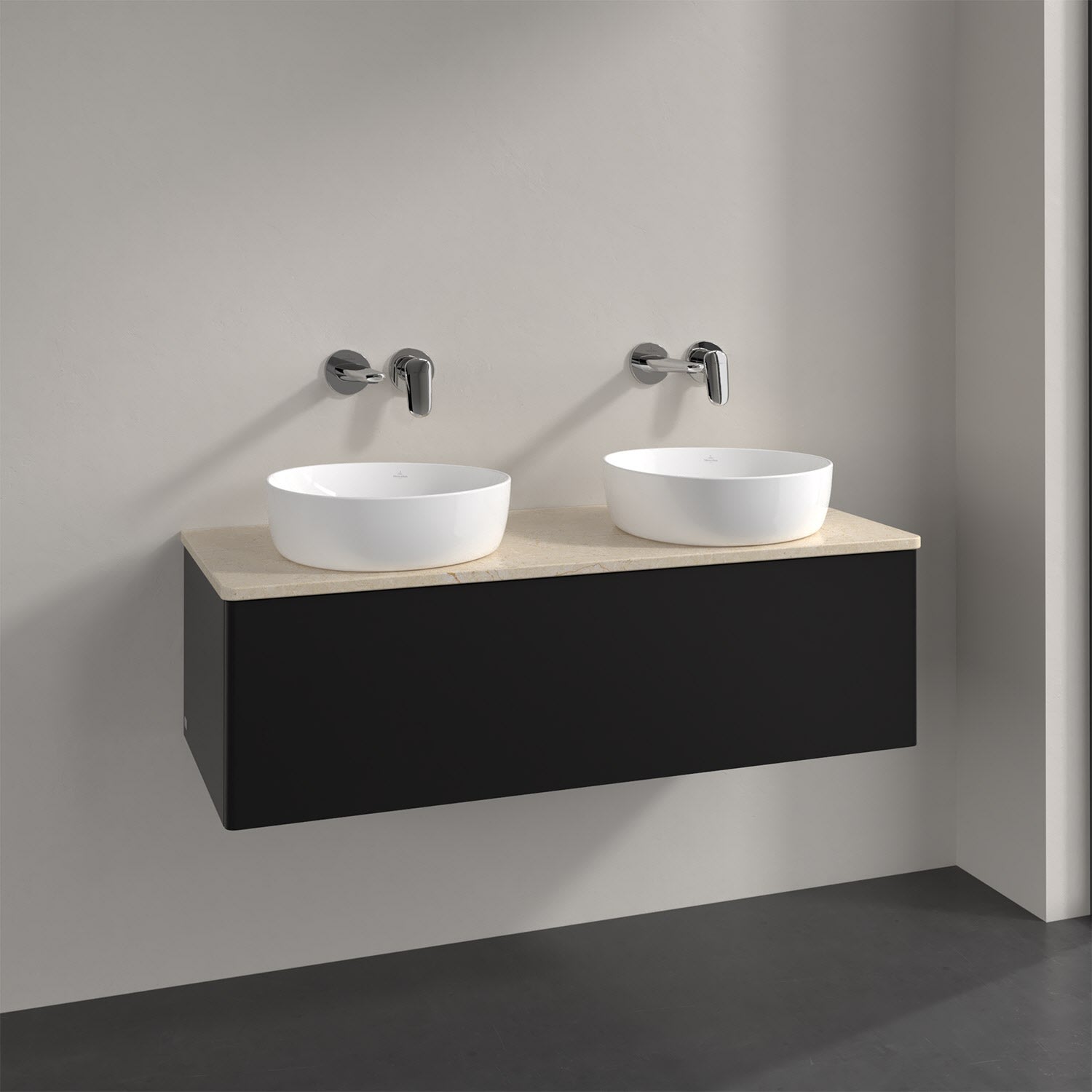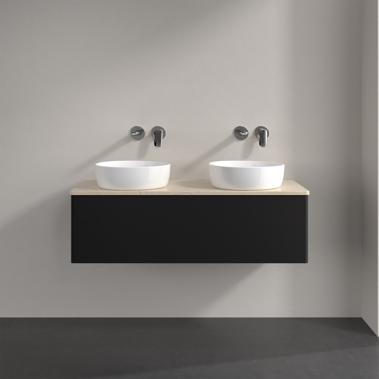 Für diesen Waschbeckenunterschrank stehen Ihnen Aufsatzwaschtische aus verschiedenen Serien zur Verfügung (siehe "Passliste" unter Downloads). Ein ausgewähltes Beispiel finden Sie im Zubehör. Den Waschtisch bitte separat mitbestellen.