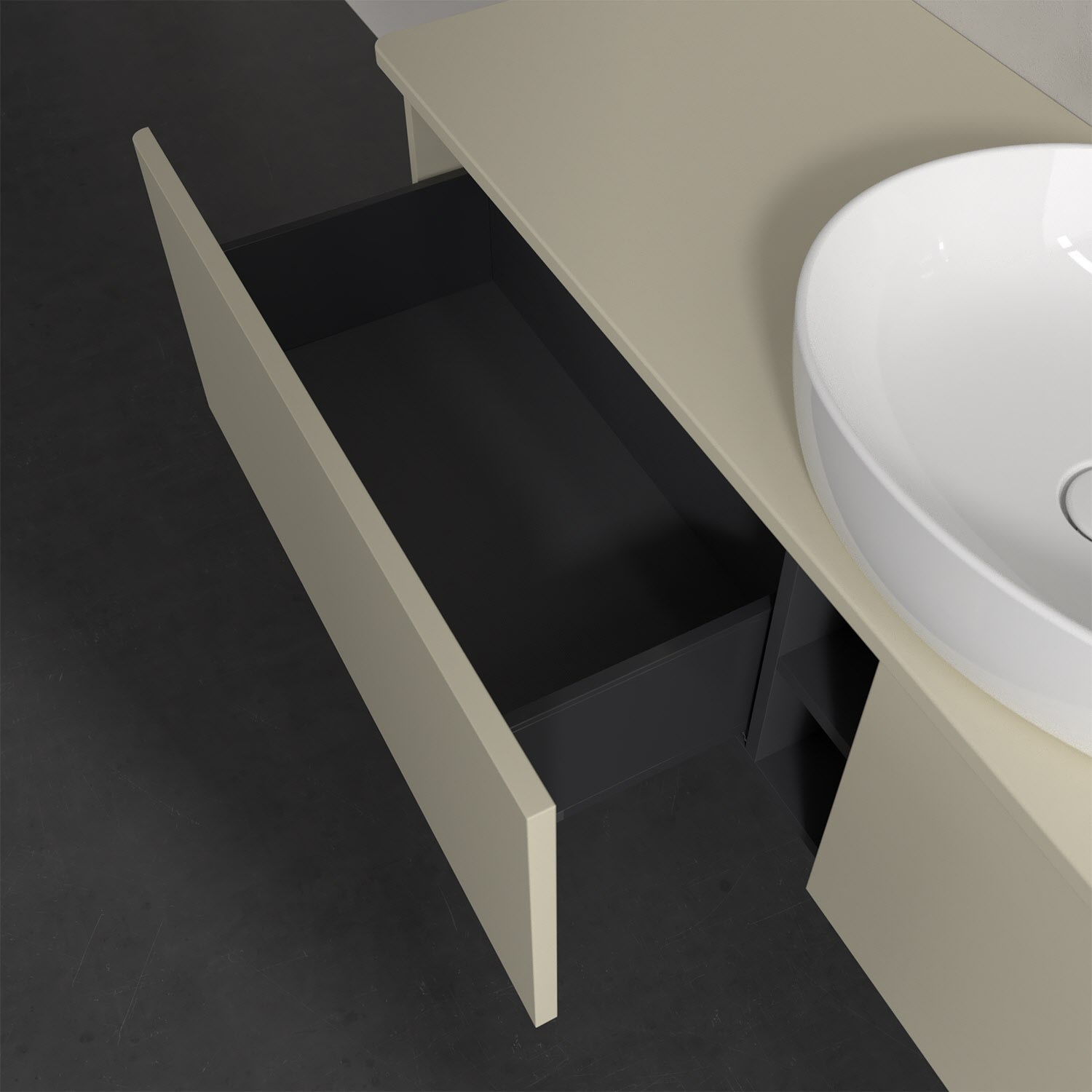 Der wandhängende Antao Waschtischunterschrank bietet mit seinen beiden extra hohen Auszügen und seiner erstaunlichen Größe viel Platz zum Verstauen von Utensilien im Badezimmer. Dank des mittig platzierten Aufsatzwaschtischs gibt es seitlich weiteren Platz für Handtücher, Seifenspender & Co. auf der Waschtischplatte. Inspiriert von der Natur überzeugt der Unterschrank auch optisch mit sanfter Formsprache und abgerundete Kanten. Die grifflosen Auszüge sind mit der Push-to-Open Funktion ausgestattet und verfügen über einen Antirutschboden, damit Utensilien sicher verstaut werden können. Mit seiner Vollauszug- und Selbsteinzug-Funktion ist der Schrank praktisch und leicht zu bedienen. Qualität von Villeroy & Boch! Für eine besonders leichte Pflege sorgt die mehrschichtig deckend lackierte Oberfläche.