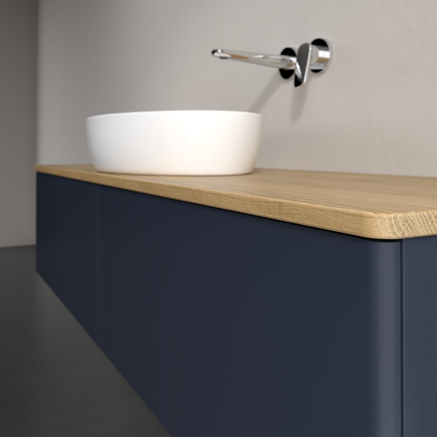 Der wandhängende Antao Waschtischunterschrank bietet mit seinen beiden extra hohen Auszügen und seiner erstaunlichen Größe viel Platz zum Verstauen von Utensilien im Badezimmer. Dank des mittig platzierten Aufsatzwaschtischs gibt es seitlich weiteren Platz für Handtücher, Seifenspender & Co. auf der Waschtischplatte. Inspiriert von der Natur überzeugt der Unterschrank auch optisch mit sanfter Formsprache und abgerundete Kanten. Die grifflosen Auszüge sind mit der Push-to-Open Funktion ausgestattet und verfügen über einen Antirutschboden, damit Utensilien sicher verstaut werden können. Mit seiner Vollauszug- und Selbsteinzug-Funktion ist der Schrank praktisch und leicht zu bedienen. Qualität von Villeroy & Boch! Für eine besonders leichte Pflege sorgt die mehrschichtig deckend lackierte Oberfläche. Bei der Ausführung in Massivholz wird dank des verarbeiteten Massivholzes jedes Möbel zu einem Unikat, das sich durch das lebendige Naturmaterial durch seine einzigartige Struktur und Maserung auszeichnet.