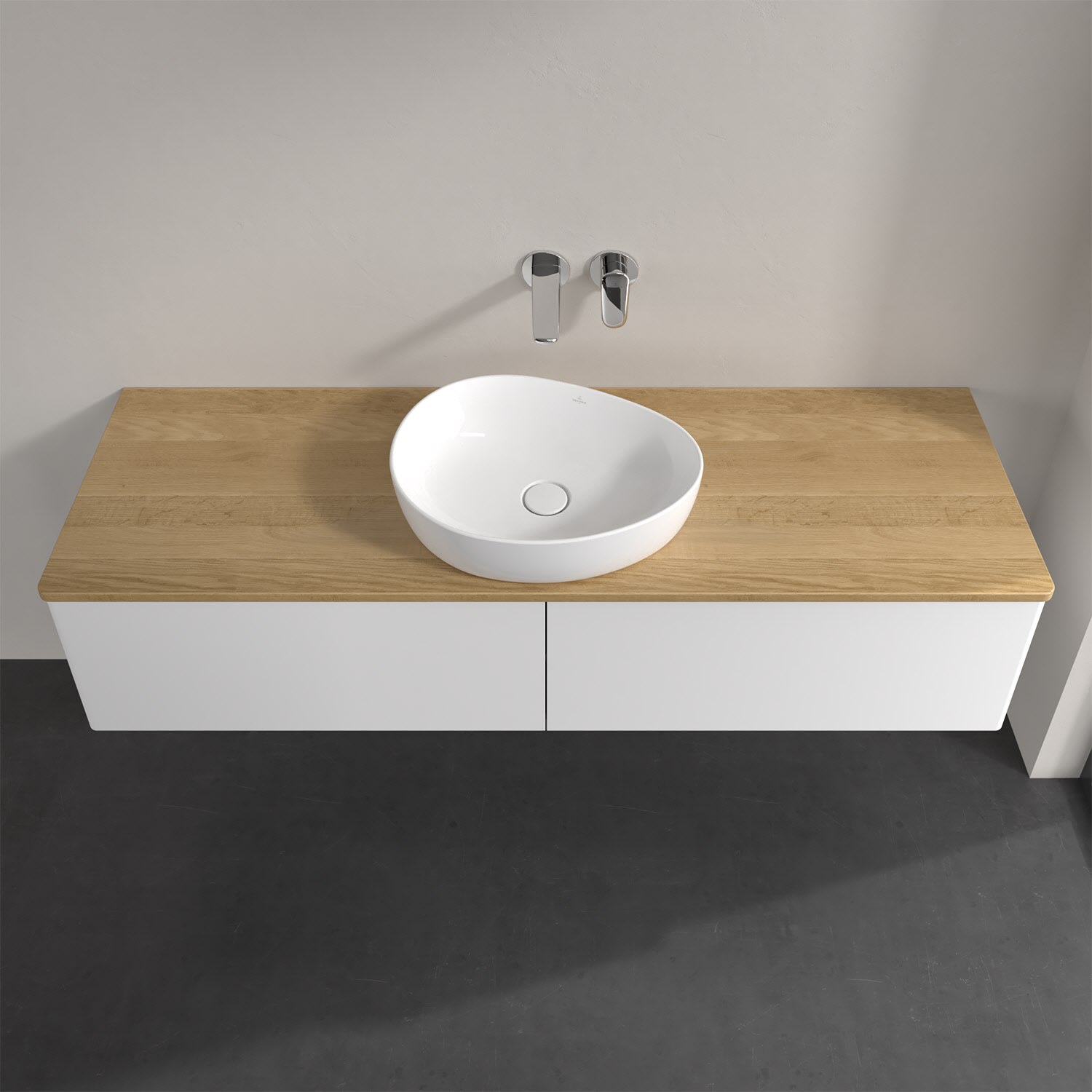 Der wandhängende Antao Waschtischunterschrank bietet mit seinen beiden extra hohen Auszügen und seiner erstaunlichen Größe viel Platz zum Verstauen von Utensilien im Badezimmer. Dank des mittig platzierten Aufsatzwaschtischs gibt es seitlich weiteren Platz für Handtücher, Seifenspender & Co. auf der Waschtischplatte. Inspiriert von der Natur überzeugt der Unterschrank auch optisch mit sanfter Formsprache und abgerundete Kanten. Die grifflosen Auszüge sind mit der Push-to-Open Funktion ausgestattet und verfügen über einen Antirutschboden, damit Utensilien sicher verstaut werden können. Mit seiner Vollauszug- und Selbsteinzug-Funktion ist der Schrank praktisch und leicht zu bedienen. Qualität von Villeroy & Boch! Für eine besonders leichte Pflege sorgt die mehrschichtig deckend lackierte Oberfläche. Bei der Ausführung in Massivholz wird dank des verarbeiteten Massivholzes jedes Möbel zu einem Unikat, das sich durch das lebendige Naturmaterial durch seine einzigartige Struktur und Maserung auszeichnet.