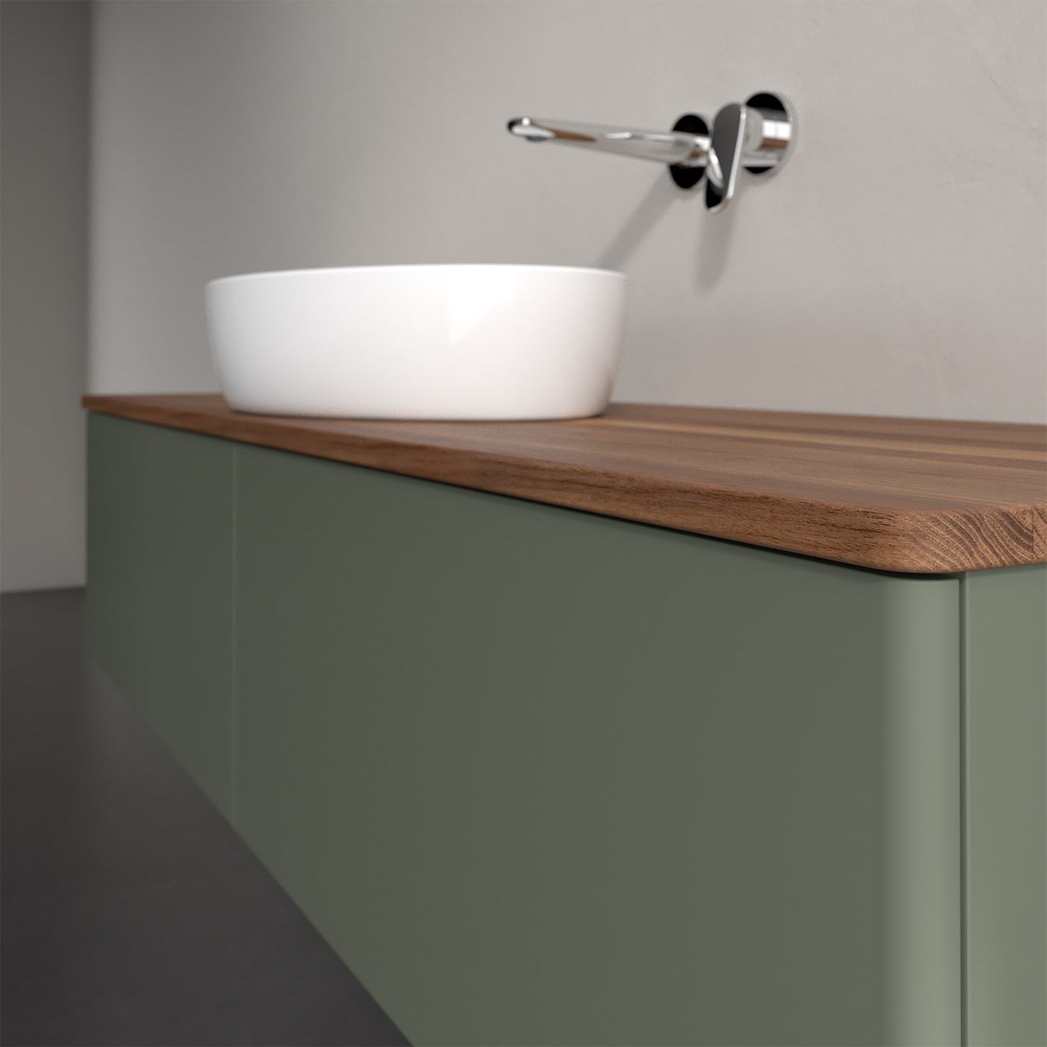Der wandhängende Antao Waschtischunterschrank bietet mit seinen beiden extra hohen Auszügen und seiner erstaunlichen Größe viel Platz zum Verstauen von Utensilien im Badezimmer. Dank des mittig platzierten Aufsatzwaschtischs gibt es seitlich weiteren Platz für Handtücher, Seifenspender & Co. auf der Waschtischplatte. Inspiriert von der Natur überzeugt der Unterschrank auch optisch mit sanfter Formsprache und abgerundete Kanten. Die grifflosen Auszüge sind mit der Push-to-Open Funktion ausgestattet und verfügen über einen Antirutschboden, damit Utensilien sicher verstaut werden können. Mit seiner Vollauszug- und Selbsteinzug-Funktion ist der Schrank praktisch und leicht zu bedienen. Qualität von Villeroy & Boch! Für eine besonders leichte Pflege sorgt die mehrschichtig deckend lackierte Oberfläche. Bei der Ausführung in Massivholz wird dank des verarbeiteten Massivholzes jedes Möbel zu einem Unikat, das sich durch das lebendige Naturmaterial durch seine einzigartige Struktur und Maserung auszeichnet.