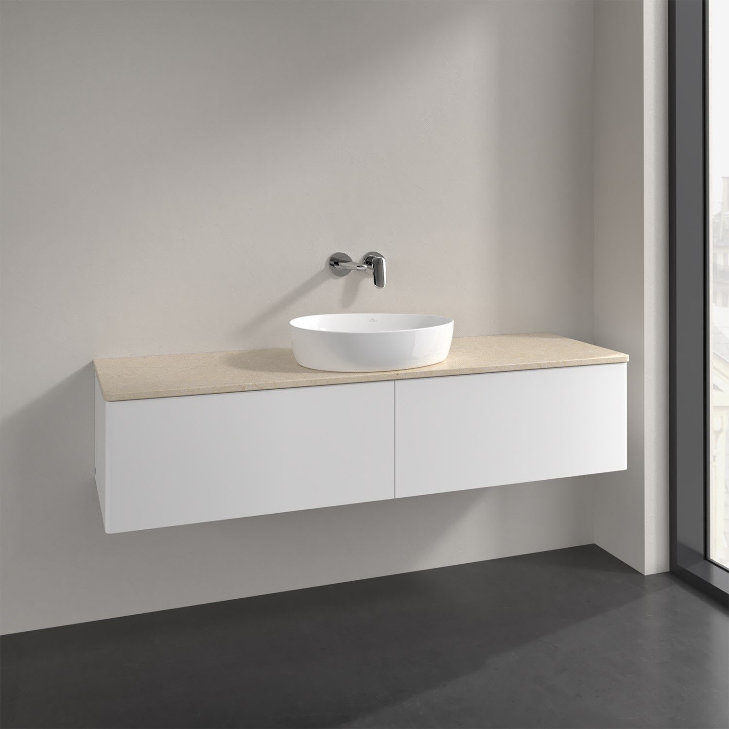 Villeroy & Boch Antao Waschbeckenunterschrank, 160 x 36 cm, 2 Auszüge, Front ohne Struktur, ohne Hahnloch, für Waschtisch mittig