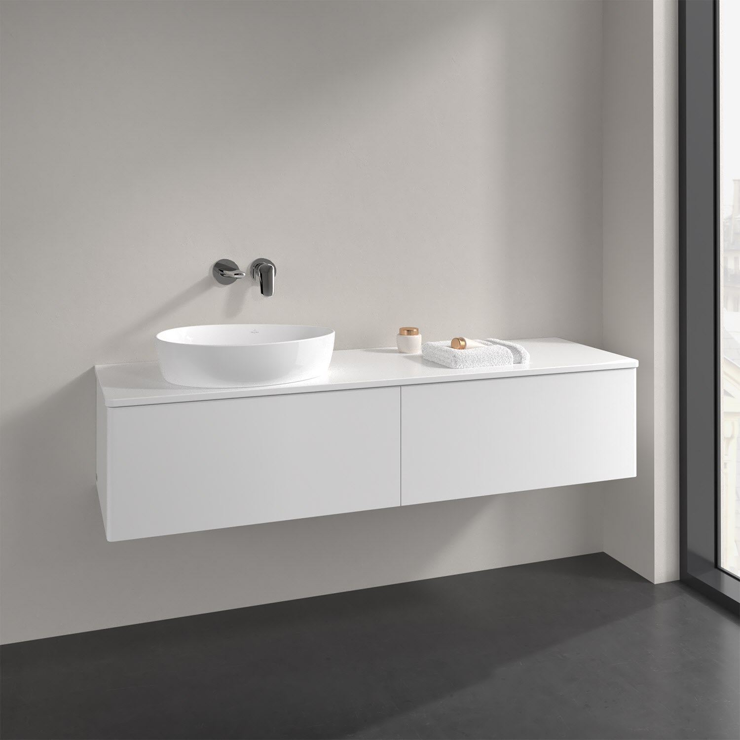 Der wandhängende Antao Waschtischunterschrank bietet mit seinen beiden extra hohen Auszügen und seiner erstaunlichen Größe viel Platz zum Verstauen von Utensilien im Badezimmer. Dank des seitlich platzierten Aufsatzwaschtischs gibt es daneben weiteren Platz für Handtücher, Seifenspender & Co. auf der Waschtischplatte. Inspiriert von der Natur überzeugt der Unterschrank auch optisch mit sanfter Formsprache und abgerundete Kanten. Die grifflosen Auszüge sind mit der Push-to-Open Funktion ausgestattet und verfügen über einen Antirutschboden, damit Utensilien sicher verstaut werden können. Mit seiner Vollauszug- und Selbsteinzug-Funktion ist der Schrank praktisch und leicht zu bedienen. Qualität von Villeroy & Boch! Für eine besonders leichte Pflege sorgt die mehrschichtig deckend lackierte Oberfläche.