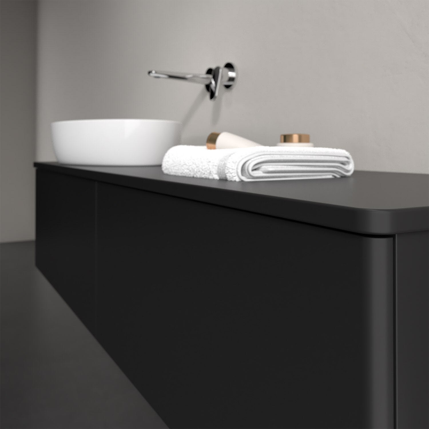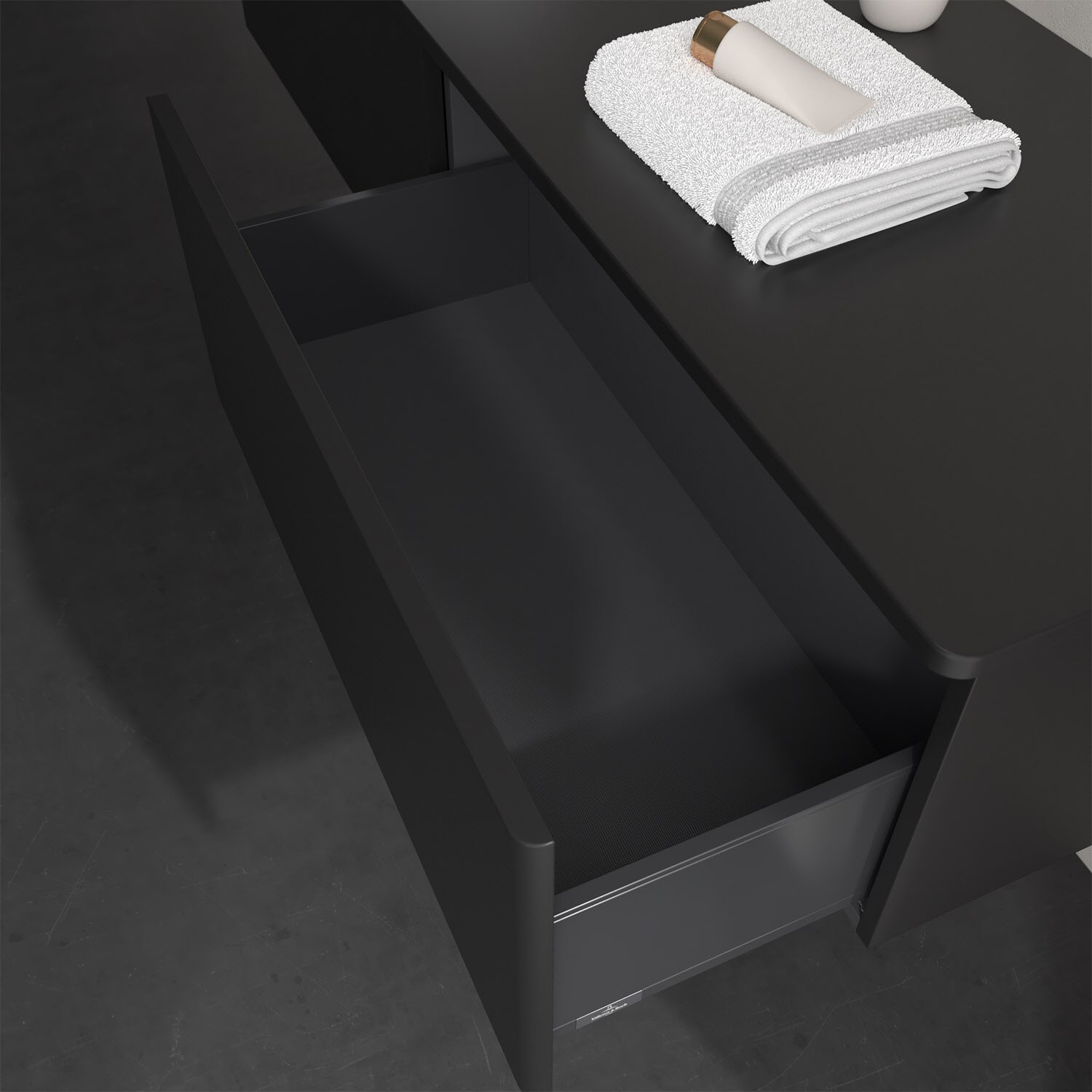 Der wandhängende Antao Waschtischunterschrank bietet mit seinen beiden extra hohen Auszügen und seiner erstaunlichen Größe viel Platz zum Verstauen von Utensilien im Badezimmer. Dank des seitlich platzierten Aufsatzwaschtischs gibt es daneben weiteren Platz für Handtücher, Seifenspender & Co. auf der Waschtischplatte. Inspiriert von der Natur überzeugt der Unterschrank auch optisch mit sanfter Formsprache und abgerundete Kanten. Die grifflosen Auszüge sind mit der Push-to-Open Funktion ausgestattet und verfügen über einen Antirutschboden, damit Utensilien sicher verstaut werden können. Mit seiner Vollauszug- und Selbsteinzug-Funktion ist der Schrank praktisch und leicht zu bedienen. Qualität von Villeroy & Boch! Für eine besonders leichte Pflege sorgt die mehrschichtig deckend lackierte Oberfläche.