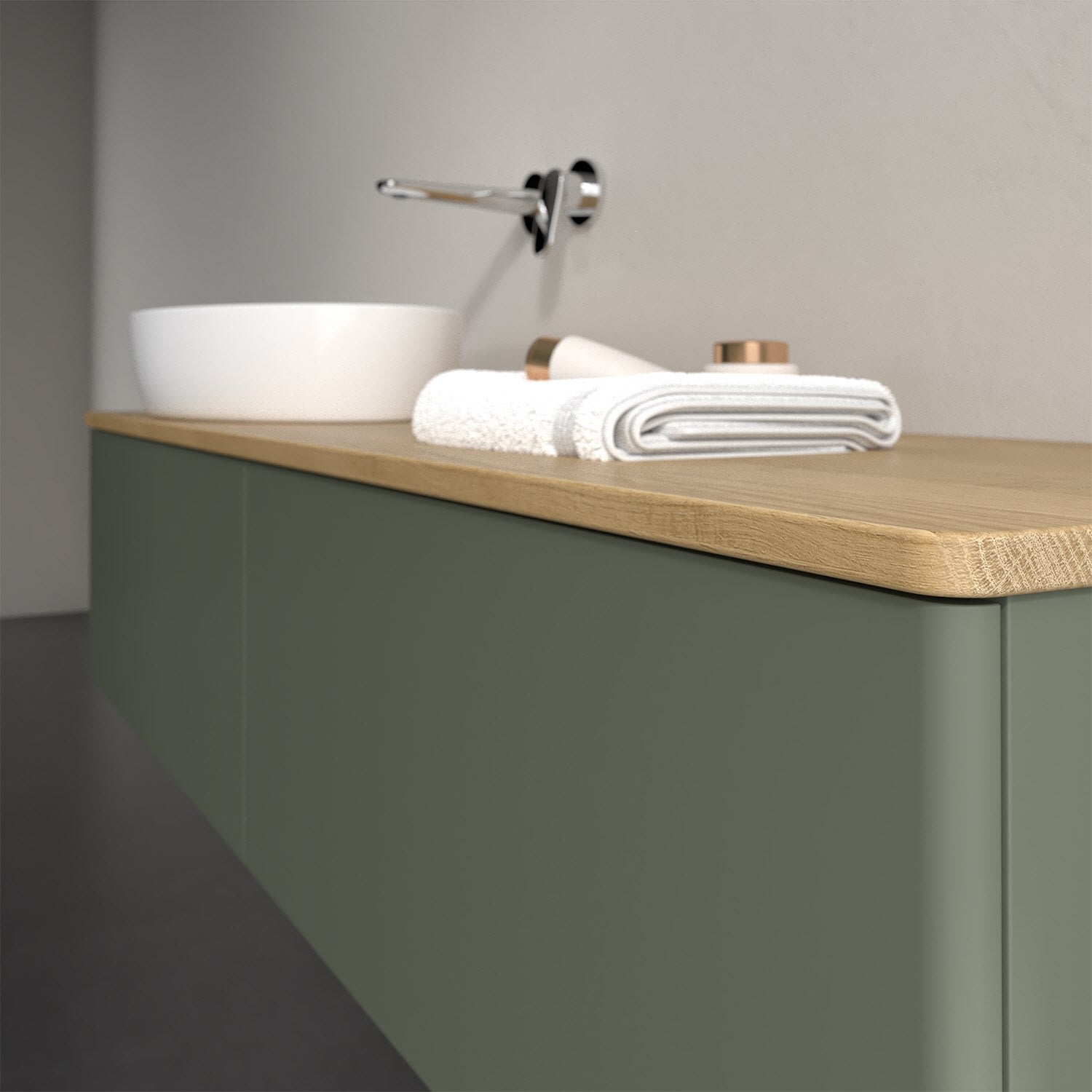 Der wandhängende Antao Waschtischunterschrank bietet mit seinen beiden extra hohen Auszügen und seiner erstaunlichen Größe viel Platz zum Verstauen von Utensilien im Badezimmer. Dank des seitlich platzierten Aufsatzwaschtischs gibt es daneben weiteren Platz für Handtücher, Seifenspender & Co. auf der Waschtischplatte. Inspiriert von der Natur überzeugt der Unterschrank auch optisch mit sanfter Formsprache und abgerundete Kanten. Die grifflosen Auszüge sind mit der Push-to-Open Funktion ausgestattet und verfügen über einen Antirutschboden, damit Utensilien sicher verstaut werden können. Mit seiner Vollauszug- und Selbsteinzug-Funktion ist der Schrank praktisch und leicht zu bedienen. Qualität von Villeroy & Boch! Für eine besonders leichte Pflege sorgt die mehrschichtig deckend lackierte Oberfläche. Bei der Ausführung in Massivholz wird dank des verarbeiteten Massivholzes jedes Möbel zu einem Unikat, das sich durch das lebendige Naturmaterial durch seine einzigartige Struktur und Maserung auszeichnet.