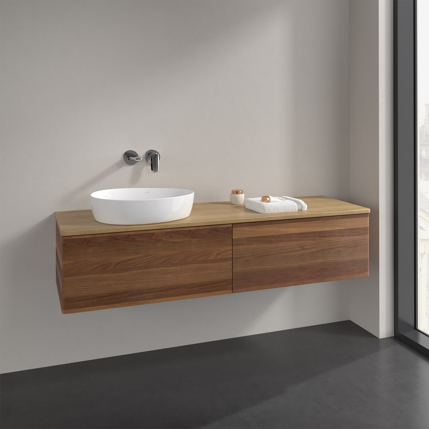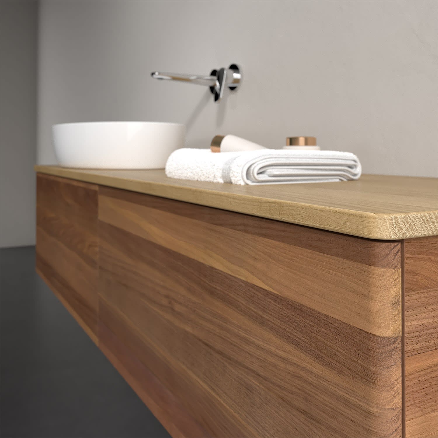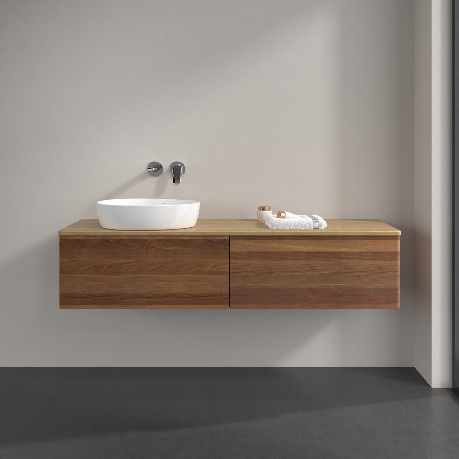Der wandhängende Antao Waschtischunterschrank bietet mit seinen beiden extra hohen Auszügen und seiner erstaunlichen Größe viel Platz zum Verstauen von Utensilien im Badezimmer. Dank des seitlich platzierten Aufsatzwaschtischs gibt es daneben weiteren Platz für Handtücher, Seifenspender & Co. auf der Waschtischplatte. Inspiriert von der Natur überzeugt der Unterschrank auch optisch mit sanfter Formsprache und abgerundete Kanten. Die grifflosen Auszüge sind mit der Push-to-Open Funktion ausgestattet und verfügen über einen Antirutschboden, damit Utensilien sicher verstaut werden können. Mit seiner Vollauszug- und Selbsteinzug-Funktion ist der Schrank praktisch und leicht zu bedienen. Qualität von Villeroy & Boch! Für eine besonders leichte Pflege sorgt die mehrschichtig deckend lackierte Oberfläche. Bei der Ausführung in Massivholz wird dank des verarbeiteten Massivholzes jedes Möbel zu einem Unikat, das sich durch das lebendige Naturmaterial durch seine einzigartige Struktur und Maserung auszeichnet.