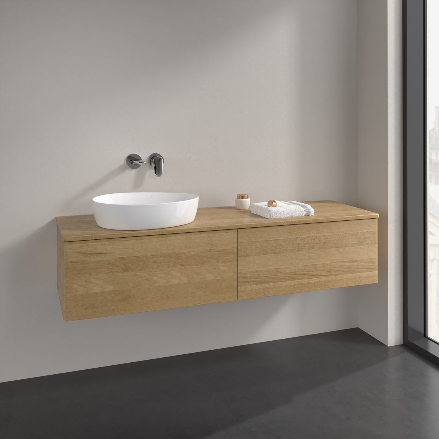 Der wandhängende Antao Waschtischunterschrank bietet mit seinen beiden extra hohen Auszügen und seiner erstaunlichen Größe viel Platz zum Verstauen von Utensilien im Badezimmer. Dank des seitlich platzierten Aufsatzwaschtischs gibt es daneben weiteren Platz für Handtücher, Seifenspender & Co. auf der Waschtischplatte. Inspiriert von der Natur überzeugt der Unterschrank auch optisch mit sanfter Formsprache und abgerundete Kanten. Die grifflosen Auszüge sind mit der Push-to-Open Funktion ausgestattet und verfügen über einen Antirutschboden, damit Utensilien sicher verstaut werden können. Mit seiner Vollauszug- und Selbsteinzug-Funktion ist der Schrank praktisch und leicht zu bedienen. Qualität von Villeroy & Boch! Für eine besonders leichte Pflege sorgt die mehrschichtig deckend lackierte Oberfläche. Bei der Ausführung in Massivholz wird dank des verarbeiteten Massivholzes jedes Möbel zu einem Unikat, das sich durch das lebendige Naturmaterial durch seine einzigartige Struktur und Maserung auszeichnet.