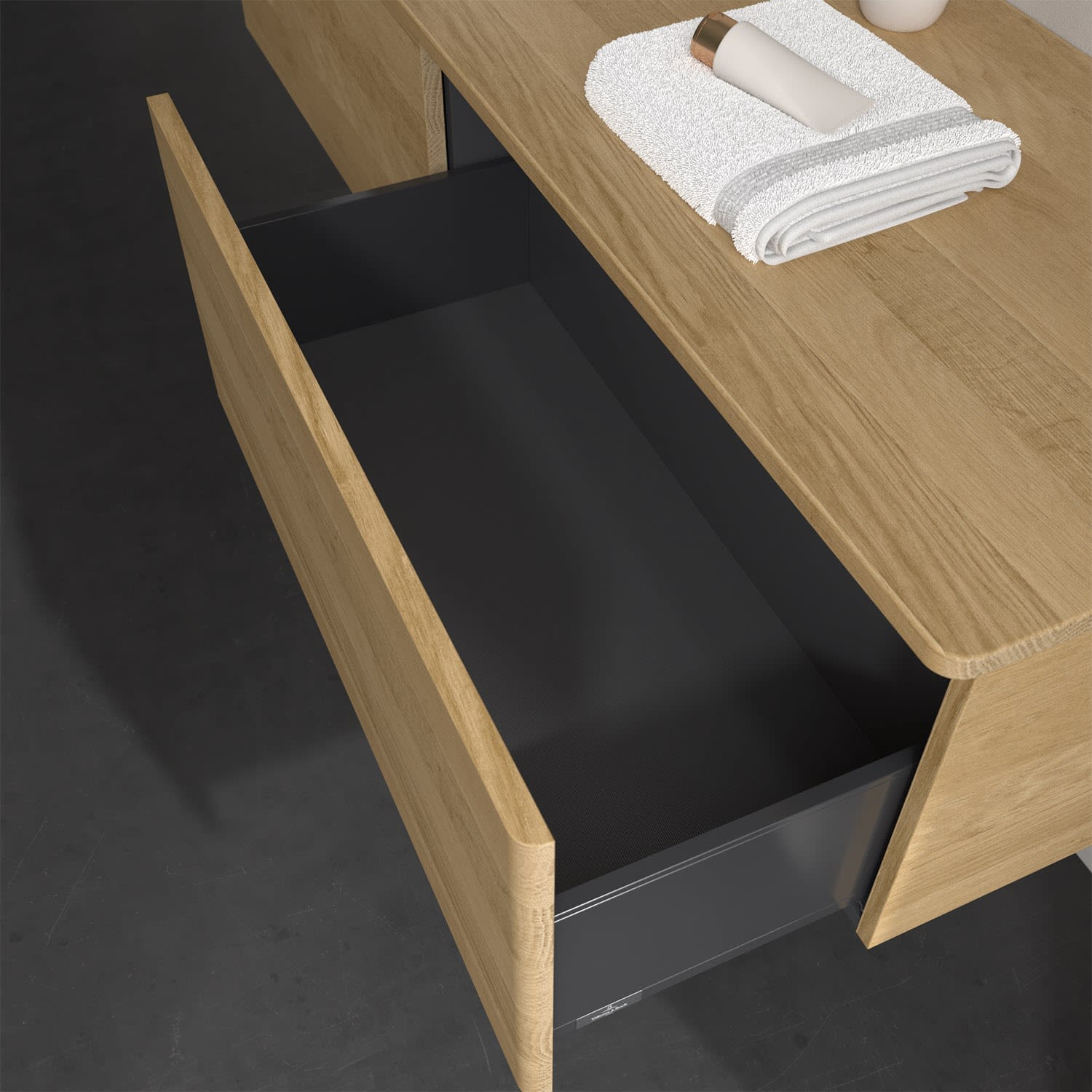 - kein Umfallen oder Verrutschen von Pflegeprodukten in den Schubladen dank rutschhemmendem Boden