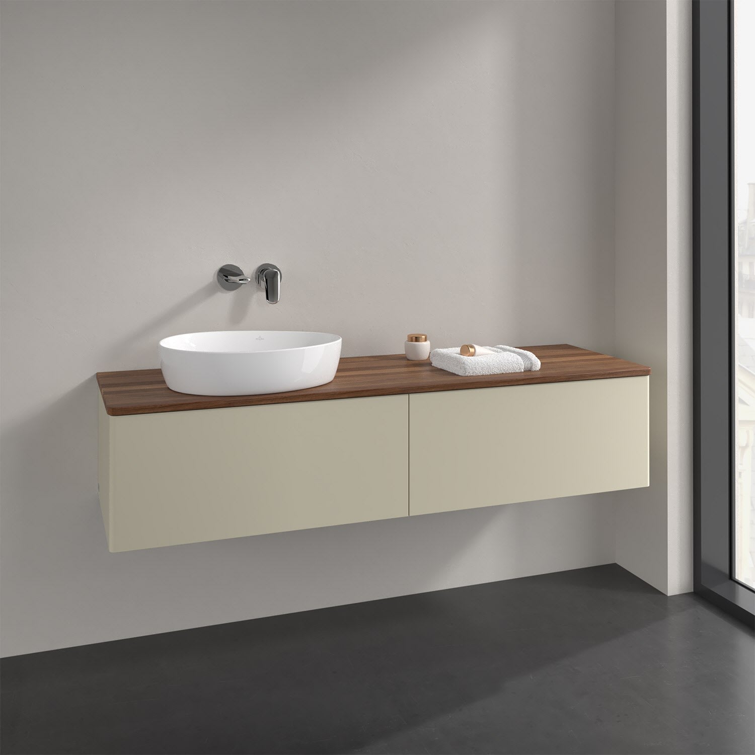 Für diesen Waschbeckenunterschrank stehen Ihnen Aufsatzwaschtische aus verschiedenen Serien zur Verfügung (siehe "Passliste" unter Downloads). Ein ausgewähltes Beispiel finden Sie im Zubehör. Den Waschtisch bitte separat mitbestellen.