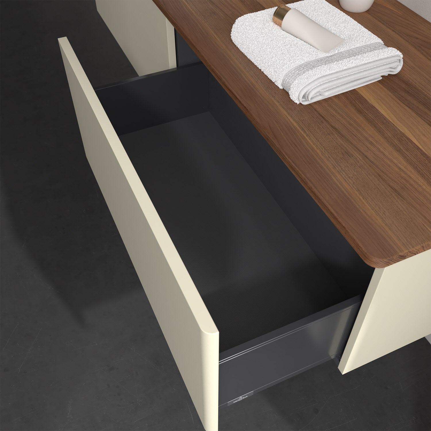 - kein Umfallen oder Verrutschen von Pflegeprodukten in den Schubladen dank rutschhemmendem Boden