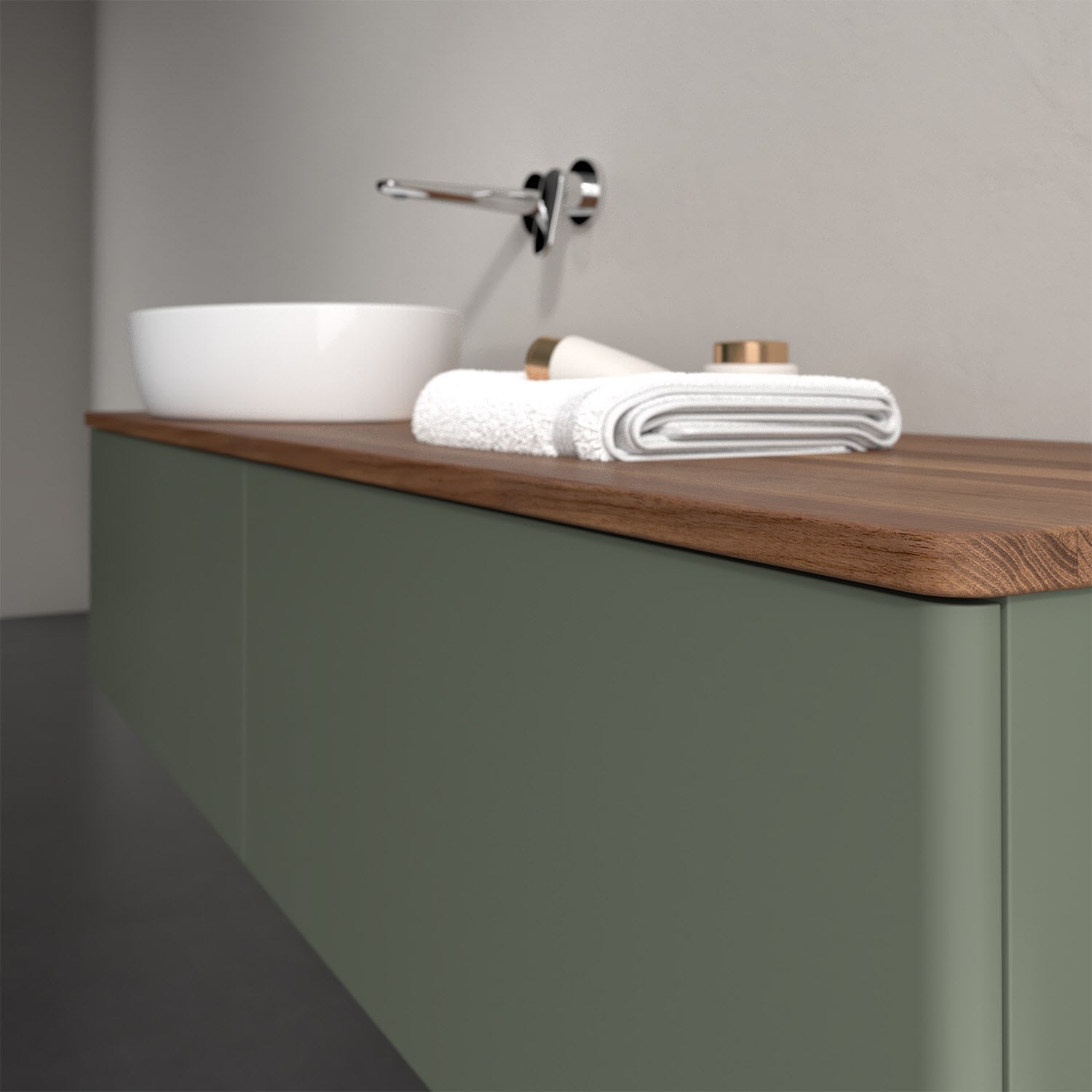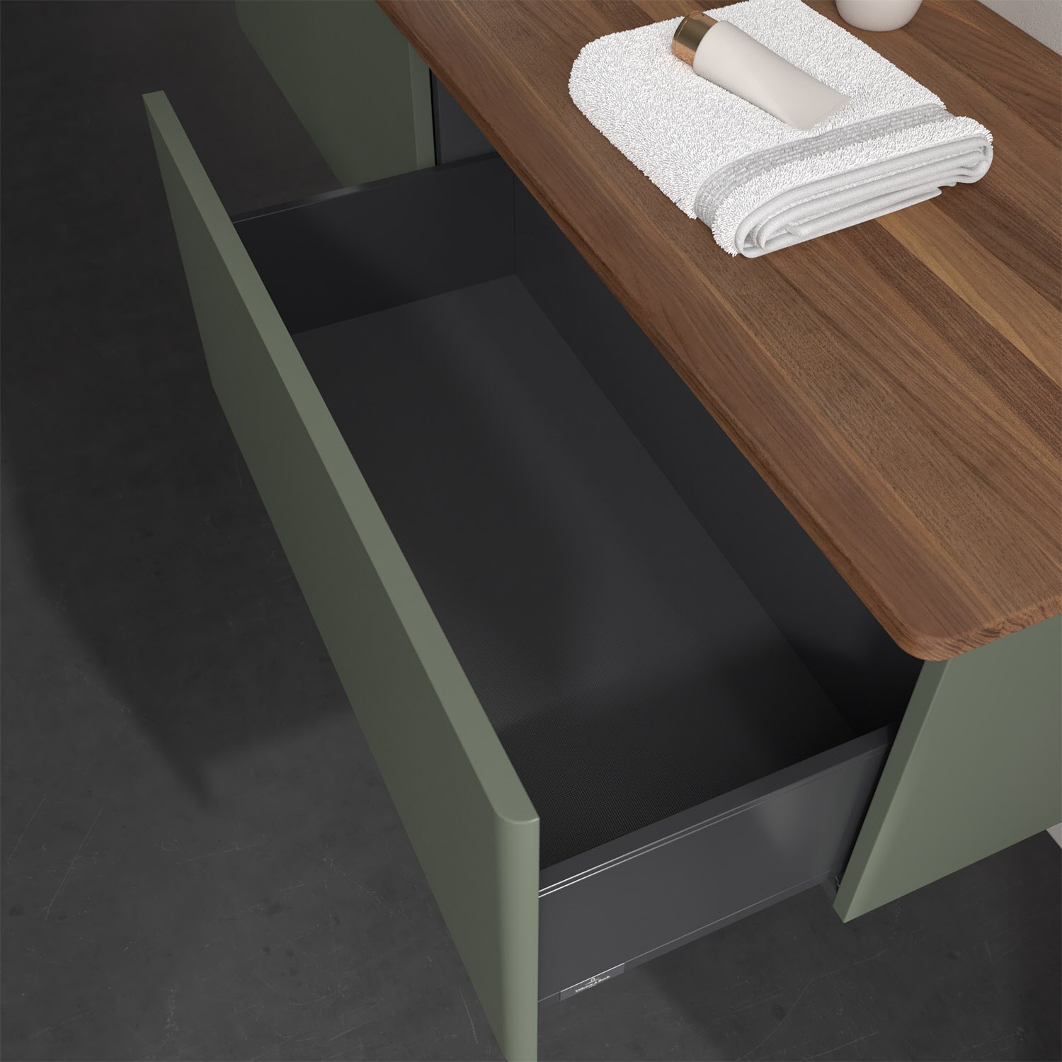 Der wandhängende Antao Waschtischunterschrank bietet mit seinen beiden extra hohen Auszügen und seiner erstaunlichen Größe viel Platz zum Verstauen von Utensilien im Badezimmer. Dank des seitlich platzierten Aufsatzwaschtischs gibt es daneben weiteren Platz für Handtücher, Seifenspender & Co. auf der Waschtischplatte. Inspiriert von der Natur überzeugt der Unterschrank auch optisch mit sanfter Formsprache und abgerundete Kanten. Die grifflosen Auszüge sind mit der Push-to-Open Funktion ausgestattet und verfügen über einen Antirutschboden, damit Utensilien sicher verstaut werden können. Mit seiner Vollauszug- und Selbsteinzug-Funktion ist der Schrank praktisch und leicht zu bedienen. Qualität von Villeroy & Boch! Für eine besonders leichte Pflege sorgt die mehrschichtig deckend lackierte Oberfläche. Bei der Ausführung in Massivholz wird dank des verarbeiteten Massivholzes jedes Möbel zu einem Unikat, das sich durch das lebendige Naturmaterial durch seine einzigartige Struktur und Maserung auszeichnet.