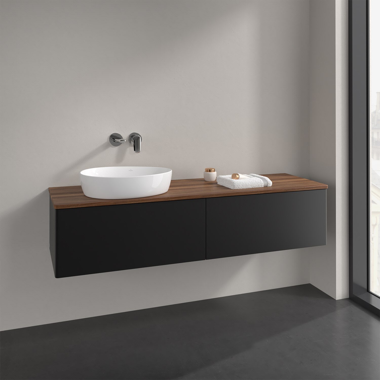 Der wandhängende Antao Waschtischunterschrank bietet mit seinen beiden extra hohen Auszügen und seiner erstaunlichen Größe viel Platz zum Verstauen von Utensilien im Badezimmer. Dank des seitlich platzierten Aufsatzwaschtischs gibt es daneben weiteren Platz für Handtücher, Seifenspender & Co. auf der Waschtischplatte. Inspiriert von der Natur überzeugt der Unterschrank auch optisch mit sanfter Formsprache und abgerundete Kanten. Die grifflosen Auszüge sind mit der Push-to-Open Funktion ausgestattet und verfügen über einen Antirutschboden, damit Utensilien sicher verstaut werden können. Mit seiner Vollauszug- und Selbsteinzug-Funktion ist der Schrank praktisch und leicht zu bedienen. Qualität von Villeroy & Boch! Für eine besonders leichte Pflege sorgt die mehrschichtig deckend lackierte Oberfläche. Bei der Ausführung in Massivholz wird dank des verarbeiteten Massivholzes jedes Möbel zu einem Unikat, das sich durch das lebendige Naturmaterial durch seine einzigartige Struktur und Maserung auszeichnet.