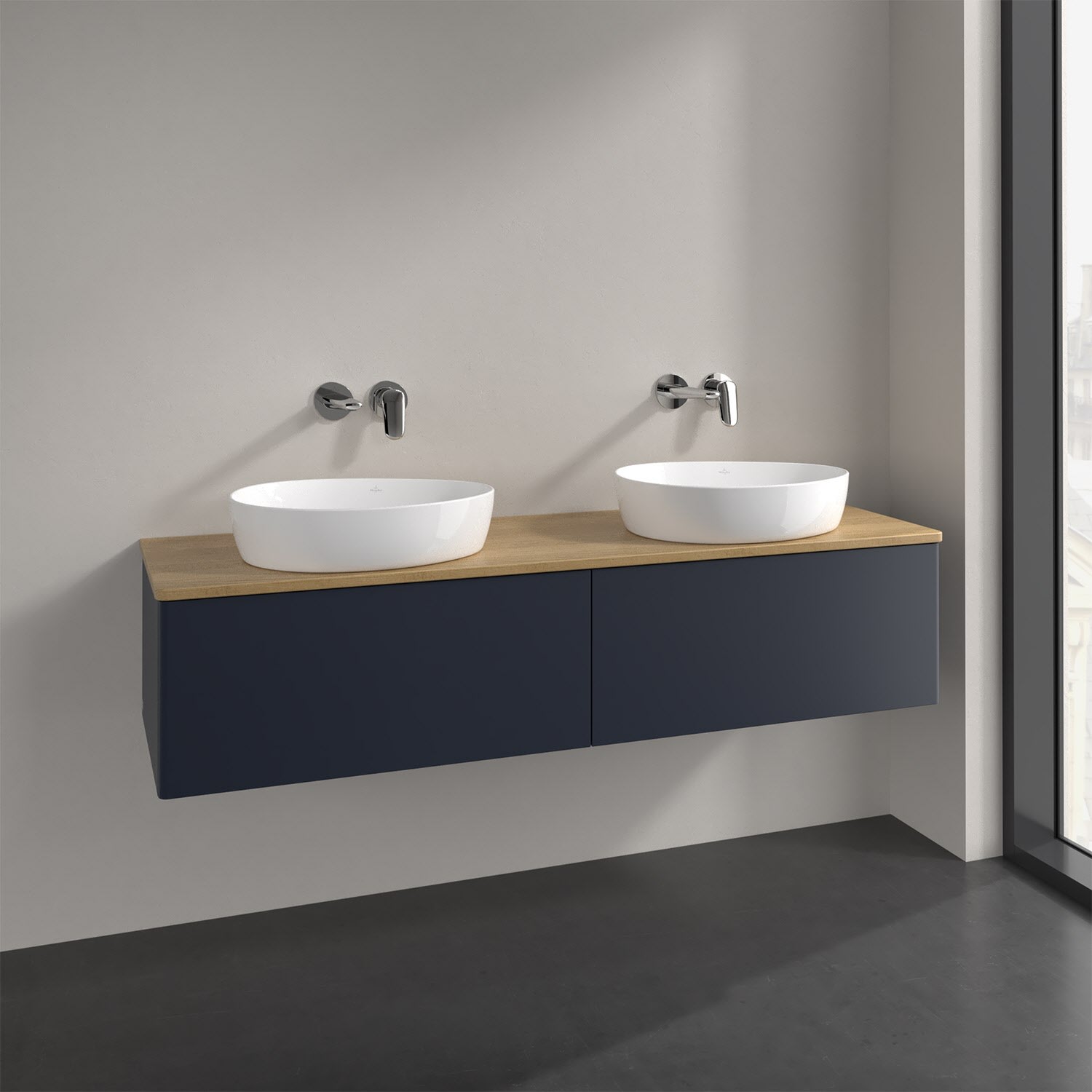 Der wandhängende Antao Waschtischunterschrank für zwei Aufsatzwaschtische bietet mit seinen beiden extra hohen Auszügen und seiner erstaunlichen Größe viel Platz zum Verstauen von Utensilien im Badezimmer. Inspiriert von der Natur überzeugt der Unterschrank auch optisch mit sanfter Formsprache und abgerundete Kanten. Die grifflosen Auszüge sind mit der Push-to-Open Funktion ausgestattet und verfügen über einen Antirutschboden, damit Utensilien sicher verstaut werden können. Mit seiner Vollauszug- und Selbsteinzug-Funktion ist der Schrank praktisch und leicht zu bedienen. Qualität von Villeroy & Boch! Für eine besonders leichte Pflege sorgt die mehrschichtig deckend lackierte Oberfläche. Bei der Ausführung in Massivholz wird dank des verarbeiteten Massivholzes jedes Möbel zu einem Unikat, das sich durch das lebendige Naturmaterial durch seine einzigartige Struktur und Maserung auszeichnet.