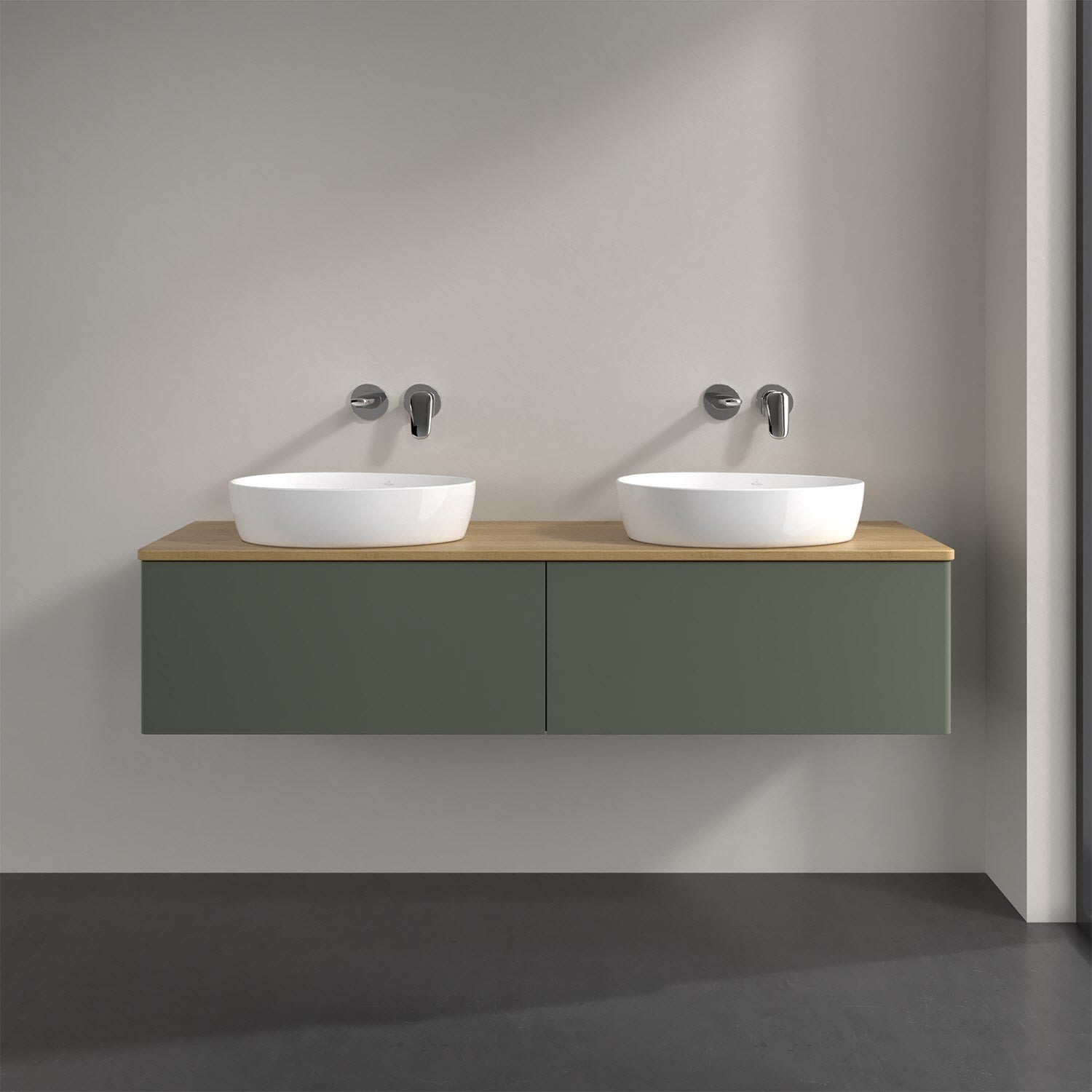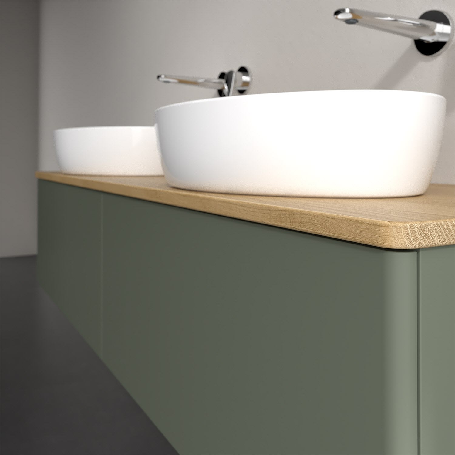 Der wandhängende Antao Waschtischunterschrank für zwei Aufsatzwaschtische bietet mit seinen beiden extra hohen Auszügen und seiner erstaunlichen Größe viel Platz zum Verstauen von Utensilien im Badezimmer. Inspiriert von der Natur überzeugt der Unterschrank auch optisch mit sanfter Formsprache und abgerundete Kanten. Die grifflosen Auszüge sind mit der Push-to-Open Funktion ausgestattet und verfügen über einen Antirutschboden, damit Utensilien sicher verstaut werden können. Mit seiner Vollauszug- und Selbsteinzug-Funktion ist der Schrank praktisch und leicht zu bedienen. Qualität von Villeroy & Boch! Für eine besonders leichte Pflege sorgt die mehrschichtig deckend lackierte Oberfläche. Bei der Ausführung in Massivholz wird dank des verarbeiteten Massivholzes jedes Möbel zu einem Unikat, das sich durch das lebendige Naturmaterial durch seine einzigartige Struktur und Maserung auszeichnet.