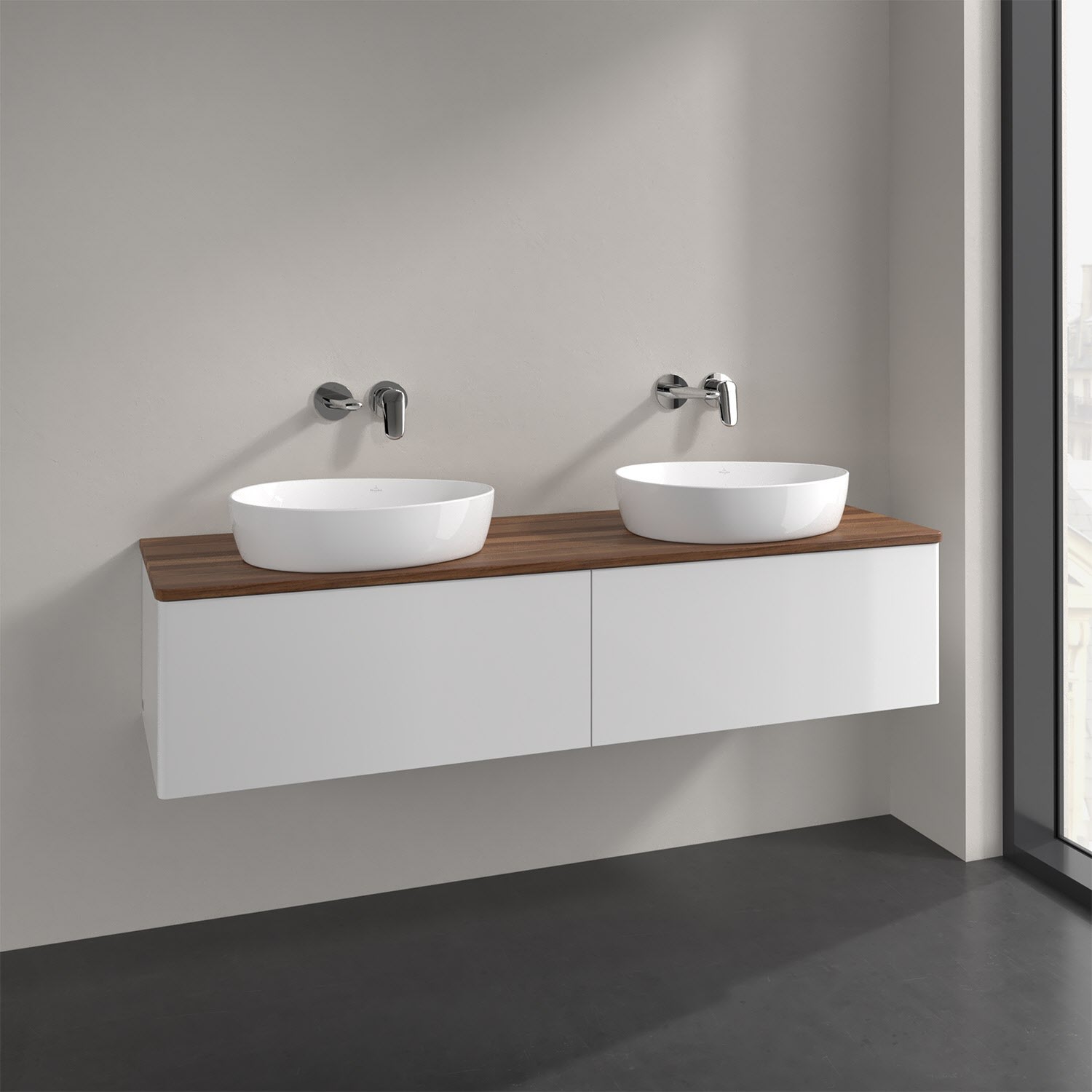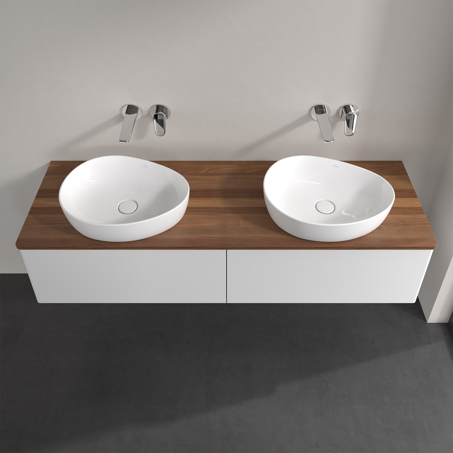 Der wandhängende Antao Waschtischunterschrank für zwei Aufsatzwaschtische bietet mit seinen beiden extra hohen Auszügen und seiner erstaunlichen Größe viel Platz zum Verstauen von Utensilien im Badezimmer. Inspiriert von der Natur überzeugt der Unterschrank auch optisch mit sanfter Formsprache und abgerundete Kanten. Die grifflosen Auszüge sind mit der Push-to-Open Funktion ausgestattet und verfügen über einen Antirutschboden, damit Utensilien sicher verstaut werden können. Mit seiner Vollauszug- und Selbsteinzug-Funktion ist der Schrank praktisch und leicht zu bedienen. Qualität von Villeroy & Boch! Für eine besonders leichte Pflege sorgt die mehrschichtig deckend lackierte Oberfläche. Bei der Ausführung in Massivholz wird dank des verarbeiteten Massivholzes jedes Möbel zu einem Unikat, das sich durch das lebendige Naturmaterial durch seine einzigartige Struktur und Maserung auszeichnet.