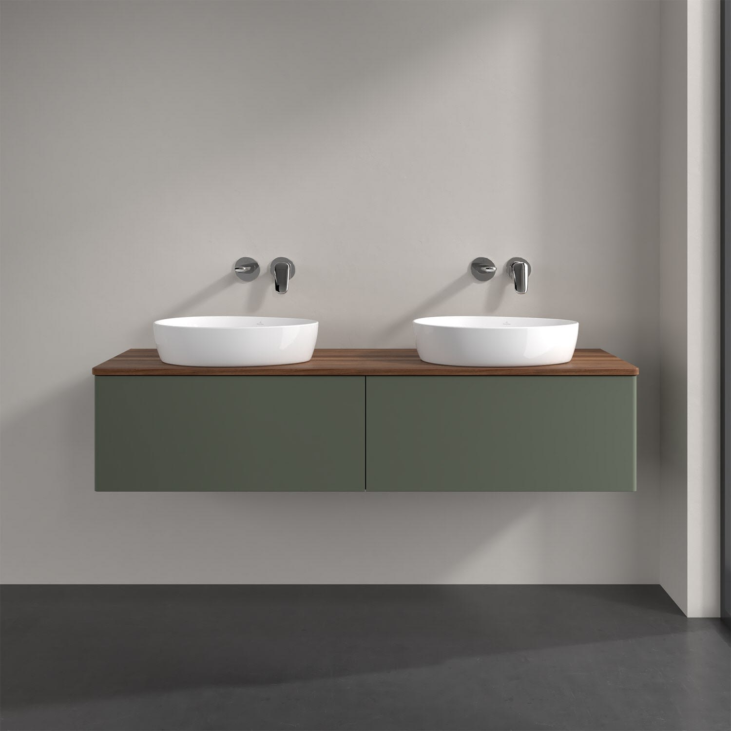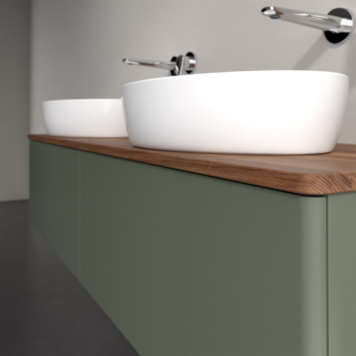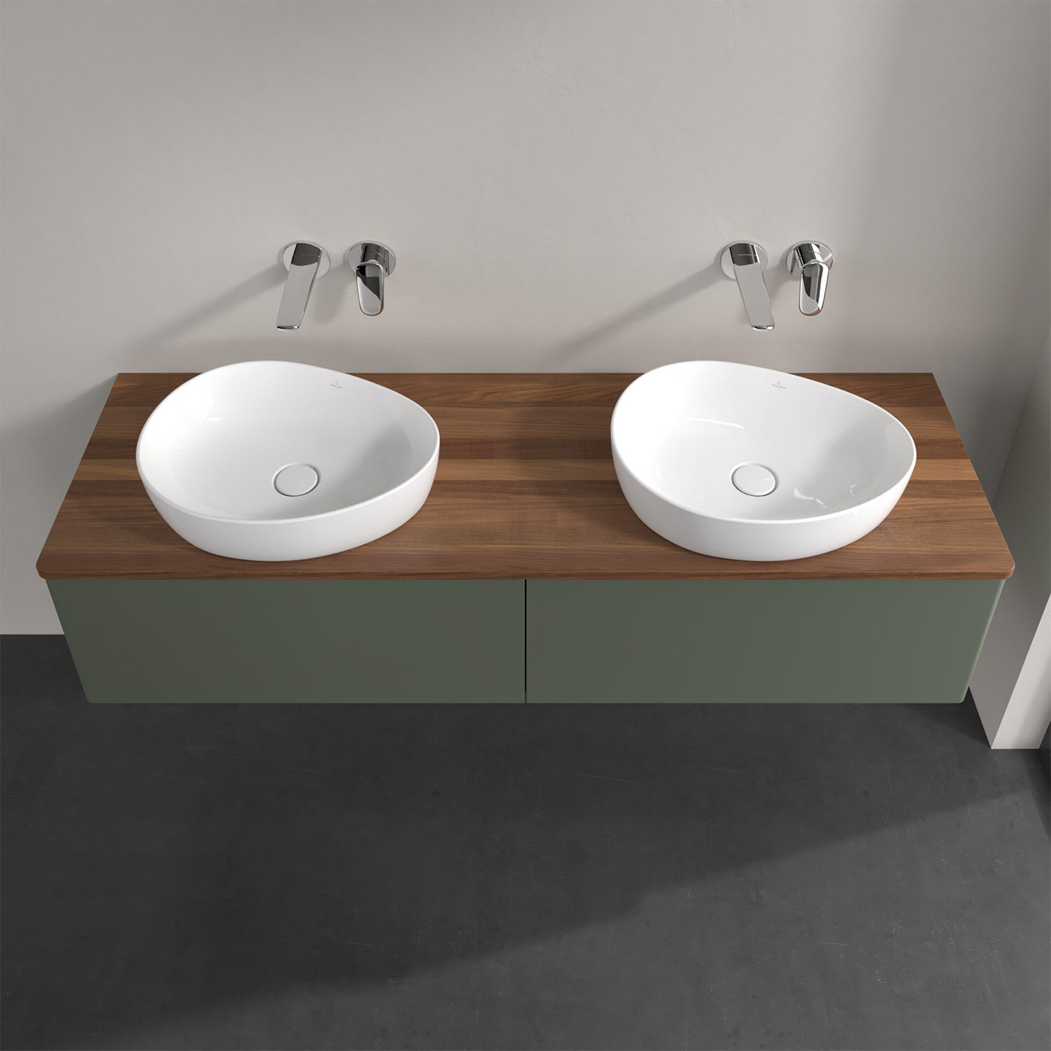 Der wandhängende Antao Waschtischunterschrank für zwei Aufsatzwaschtische bietet mit seinen beiden extra hohen Auszügen und seiner erstaunlichen Größe viel Platz zum Verstauen von Utensilien im Badezimmer. Inspiriert von der Natur überzeugt der Unterschrank auch optisch mit sanfter Formsprache und abgerundete Kanten. Die grifflosen Auszüge sind mit der Push-to-Open Funktion ausgestattet und verfügen über einen Antirutschboden, damit Utensilien sicher verstaut werden können. Mit seiner Vollauszug- und Selbsteinzug-Funktion ist der Schrank praktisch und leicht zu bedienen. Qualität von Villeroy & Boch! Für eine besonders leichte Pflege sorgt die mehrschichtig deckend lackierte Oberfläche. Bei der Ausführung in Massivholz wird dank des verarbeiteten Massivholzes jedes Möbel zu einem Unikat, das sich durch das lebendige Naturmaterial durch seine einzigartige Struktur und Maserung auszeichnet.