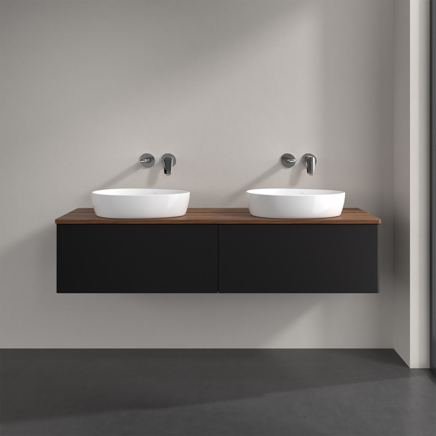 Der wandhängende Antao Waschtischunterschrank für zwei Aufsatzwaschtische bietet mit seinen beiden extra hohen Auszügen und seiner erstaunlichen Größe viel Platz zum Verstauen von Utensilien im Badezimmer. Inspiriert von der Natur überzeugt der Unterschrank auch optisch mit sanfter Formsprache und abgerundete Kanten. Die grifflosen Auszüge sind mit der Push-to-Open Funktion ausgestattet und verfügen über einen Antirutschboden, damit Utensilien sicher verstaut werden können. Mit seiner Vollauszug- und Selbsteinzug-Funktion ist der Schrank praktisch und leicht zu bedienen. Qualität von Villeroy & Boch! Für eine besonders leichte Pflege sorgt die mehrschichtig deckend lackierte Oberfläche. Bei der Ausführung in Massivholz wird dank des verarbeiteten Massivholzes jedes Möbel zu einem Unikat, das sich durch das lebendige Naturmaterial durch seine einzigartige Struktur und Maserung auszeichnet.
