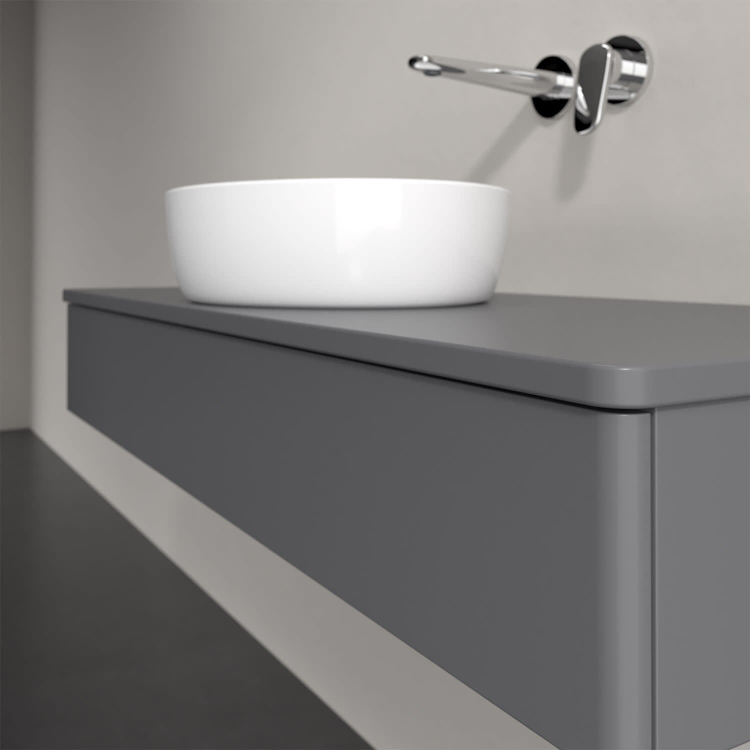 Der wandhängende Antao Waschtischunterschrank von Villeroy & Boch bietet nicht nur jede Menge Stauraum – er ist dank seines naturinspirierten Designs mit seinen abgerundeten Kanten auch noch besonders stilvoll und schafft eine gemütliche Atmosphäre im Badezimmer. Auf der Waschtischplatte bietet sich rechts und links neben dem Waschtisch viel Platz für Zahnbürstenbecher oder Seifenspender. Der geräumige Auszug bietet viel Platz, um alles Notwendige zu verstauen und Ordnung zu halten. Öffnen lässt er sich durch leichten Druck auf die grifflose Front. Dank Vollauszug hat man immer alles im Blick und der Antirutschboden verhindert ein Umfallen oder Verrutschen der Gegenstände. Einfach clever! Für eine besonders leichte Pflege sorgt die mehrschichtig deckend lackierte Oberfläche.