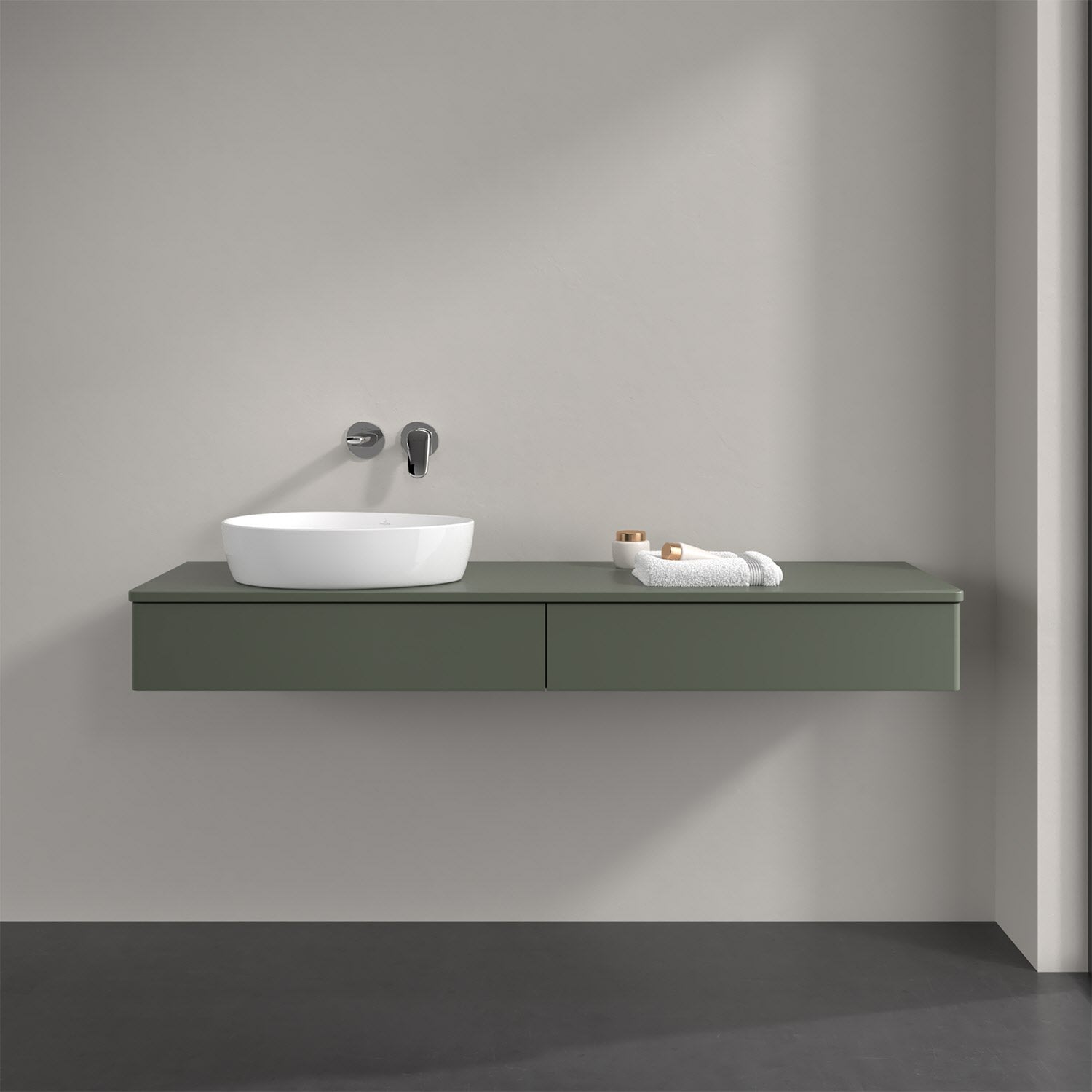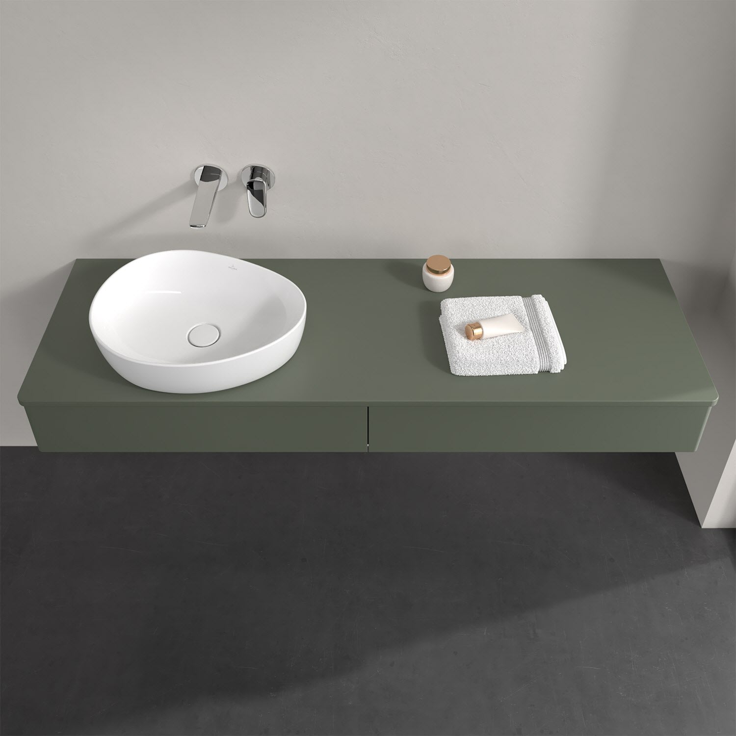 Für diesen Waschbeckenunterschrank stehen Ihnen Aufsatzwaschtische aus verschiedenen Serien zur Verfügung (siehe "Passliste" unter Downloads). Ein ausgewähltes Beispiel finden Sie im Zubehör. Den Waschtisch bitte separat mitbestellen.