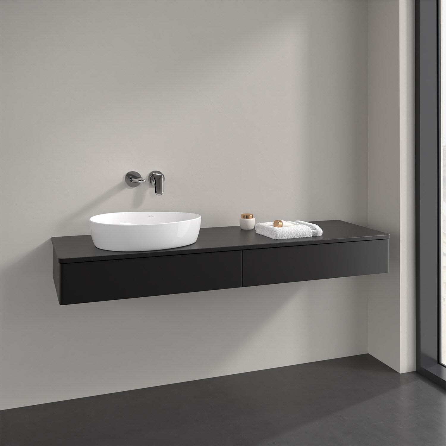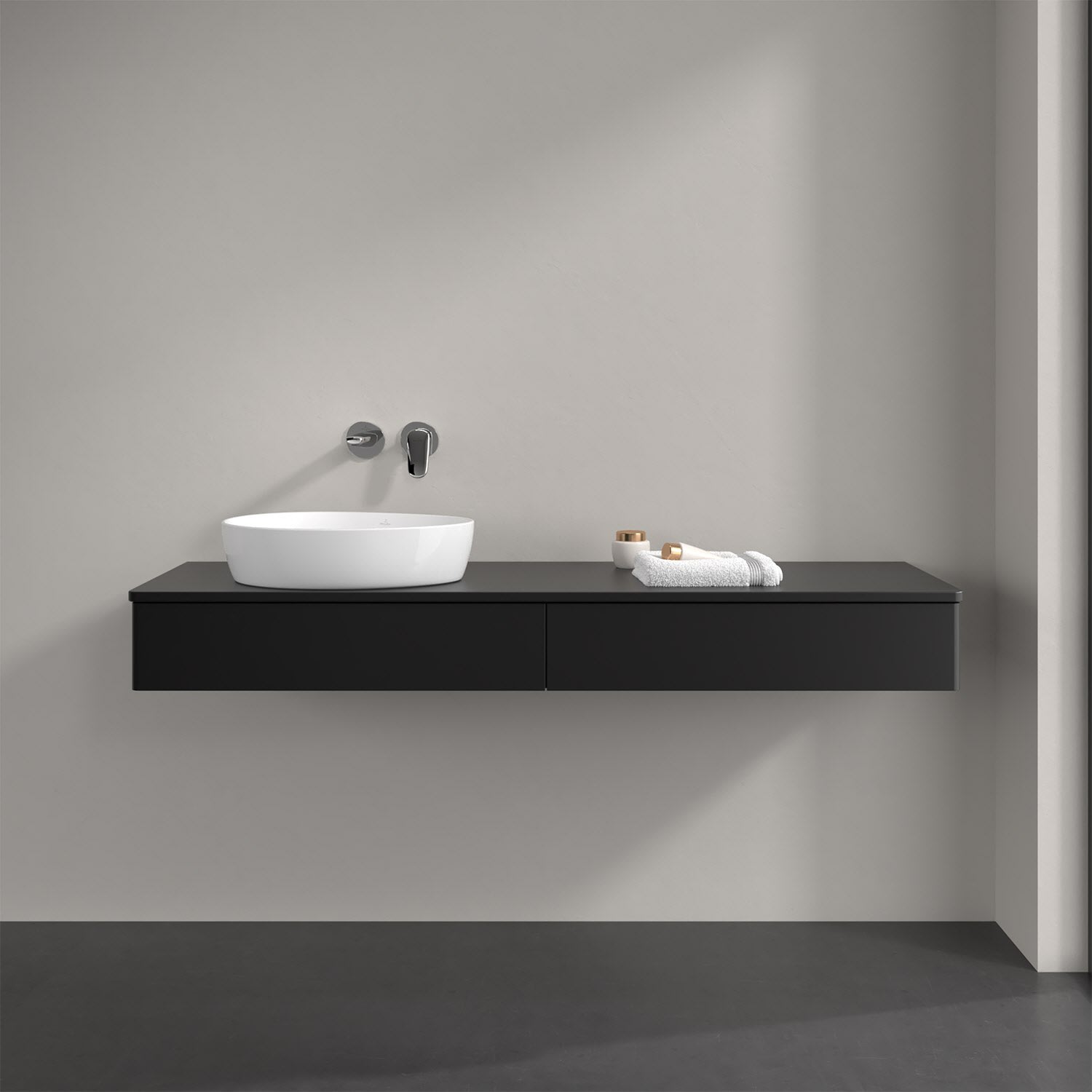 Für diesen Waschbeckenunterschrank stehen Ihnen Aufsatzwaschtische aus verschiedenen Serien zur Verfügung (siehe "Passliste" unter Downloads). Ein ausgewähltes Beispiel finden Sie im Zubehör. Den Waschtisch bitte separat mitbestellen.