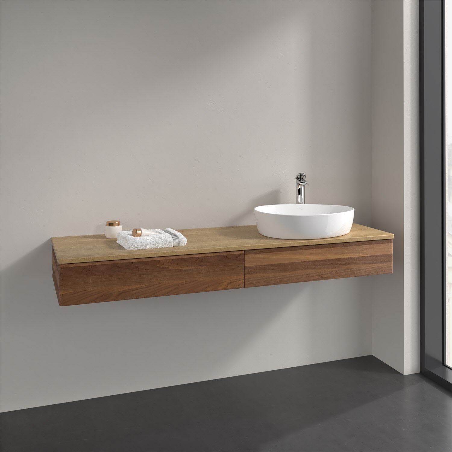 Für diesen Waschbeckenunterschrank stehen Ihnen Aufsatzwaschtische aus verschiedenen Serien zur Verfügung (siehe "Passliste" unter Downloads). Ein ausgewähltes Beispiel finden Sie im Zubehör. Den Waschtisch bitte separat mitbestellen.