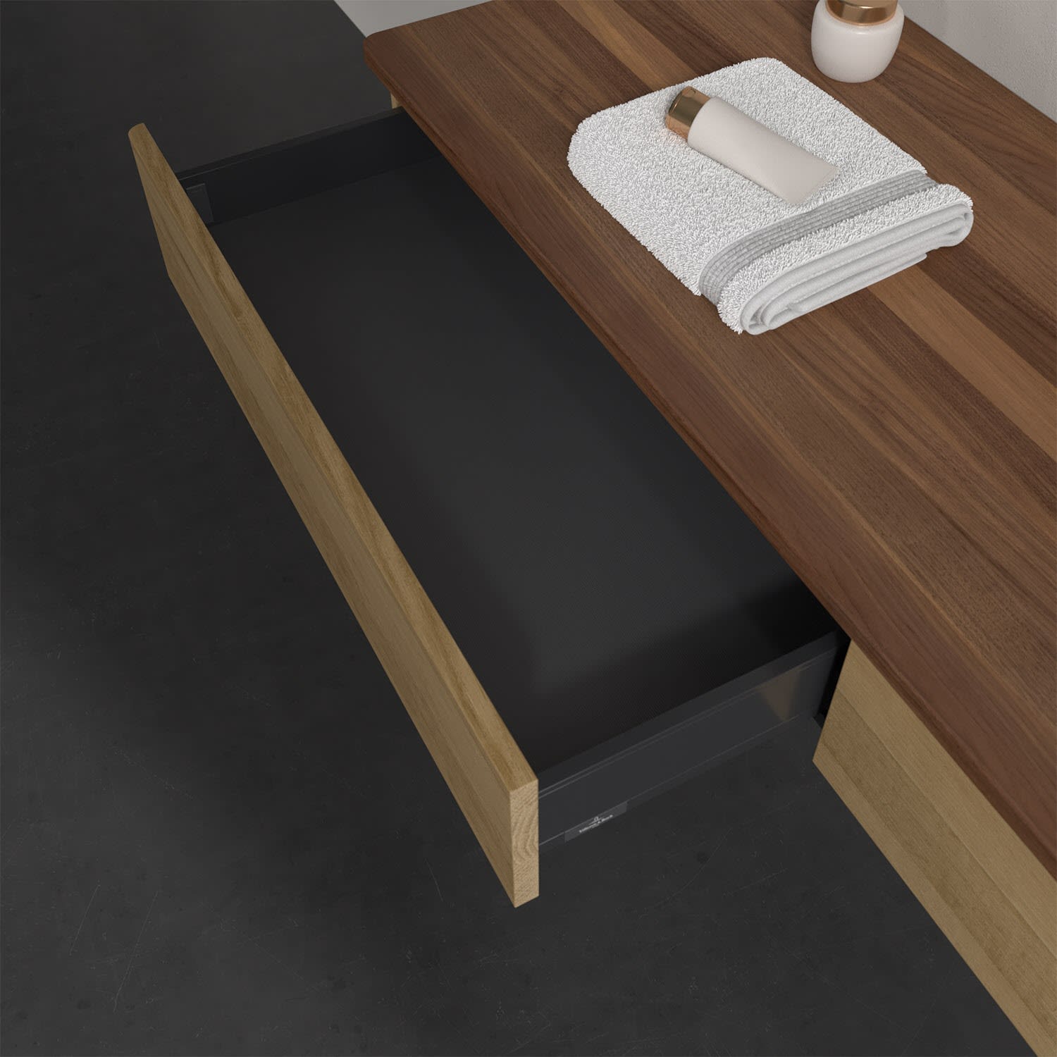 - kein Umfallen oder Verrutschen von Pflegeprodukten in den Schubladen dank rutschhemmendem Boden