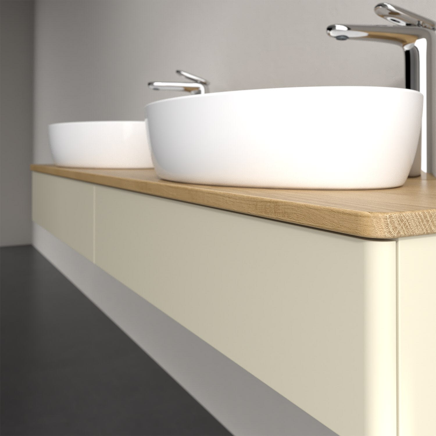 Der wandhängende Antao Waschtischunterschrank von Villeroy & Boch bietet nicht nur jede Menge Stauraum – er ist dank seines naturinspirierten Designs mit seinen abgerundeten Kanten auch noch besonders stilvoll und schafft eine gemütliche Atmosphäre im Badezimmer. Kombiniert mit zwei passenden Aufsatzwaschtischen also die ideale Wahl. Der geräumige Auszug bietet viel Platz, um alles Notwendige zu verstauen und Ordnung zu halten. Öffnen lässt er sich durch leichten Druck auf die grifflose Front. Dank Vollauszug hat man immer alles im Blick und der Antirutschboden verhindert ein Umfallen oder Verrutschen der Gegenstände. Einfach clever! Für eine besonders leichte Pflege sorgt die mehrschichtig deckend lackierte Oberfläche. Bei der Ausführung in Massivholz wird dank des verarbeiteten Massivholzes jedes Möbel zu einem Unikat, das sich durch das lebendige Naturmaterial durch seine einzigartige Struktur und Maserung auszeichnet.