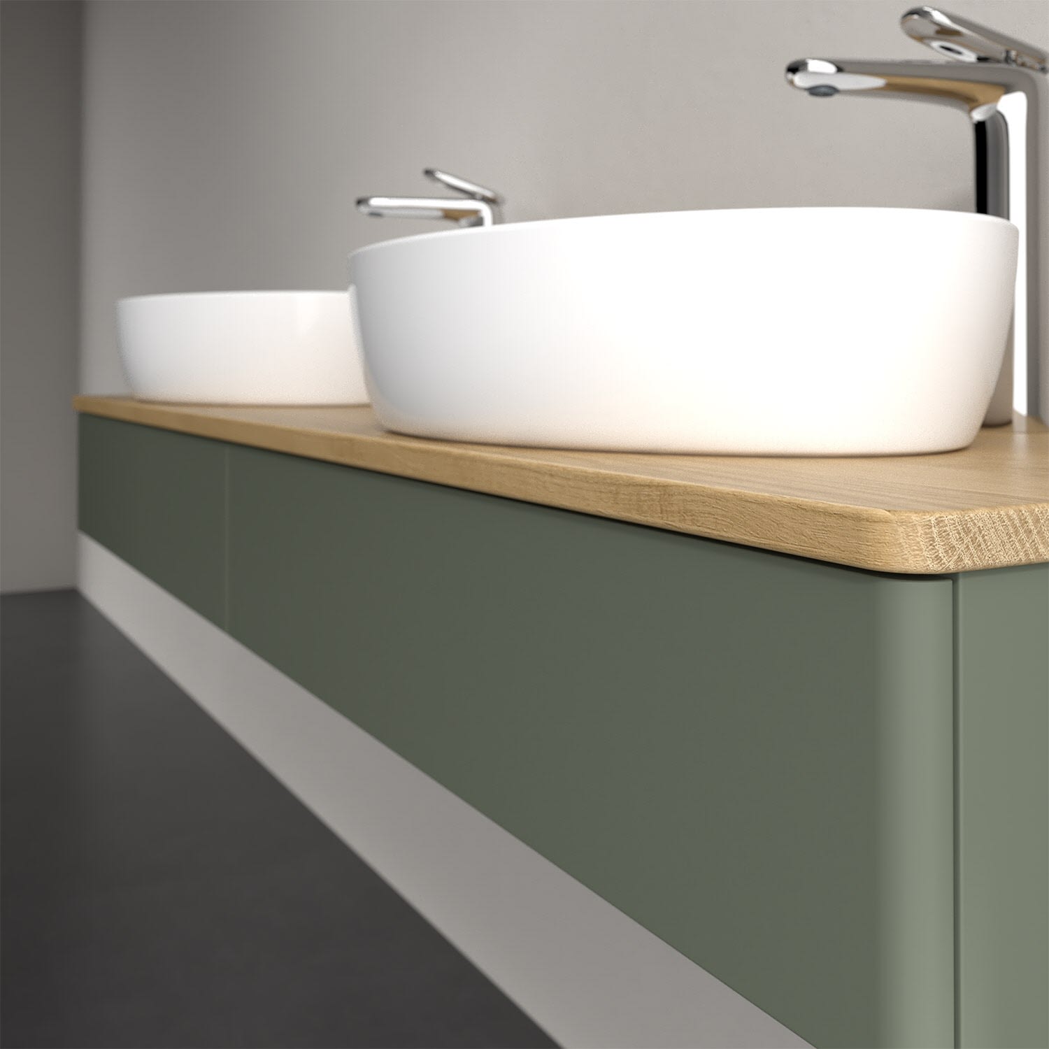 Der wandhängende Antao Waschtischunterschrank von Villeroy & Boch bietet nicht nur jede Menge Stauraum – er ist dank seines naturinspirierten Designs mit seinen abgerundeten Kanten auch noch besonders stilvoll und schafft eine gemütliche Atmosphäre im Badezimmer. Kombiniert mit zwei passenden Aufsatzwaschtischen also die ideale Wahl. Der geräumige Auszug bietet viel Platz, um alles Notwendige zu verstauen und Ordnung zu halten. Öffnen lässt er sich durch leichten Druck auf die grifflose Front. Dank Vollauszug hat man immer alles im Blick und der Antirutschboden verhindert ein Umfallen oder Verrutschen der Gegenstände. Einfach clever! Für eine besonders leichte Pflege sorgt die mehrschichtig deckend lackierte Oberfläche. Bei der Ausführung in Massivholz wird dank des verarbeiteten Massivholzes jedes Möbel zu einem Unikat, das sich durch das lebendige Naturmaterial durch seine einzigartige Struktur und Maserung auszeichnet.