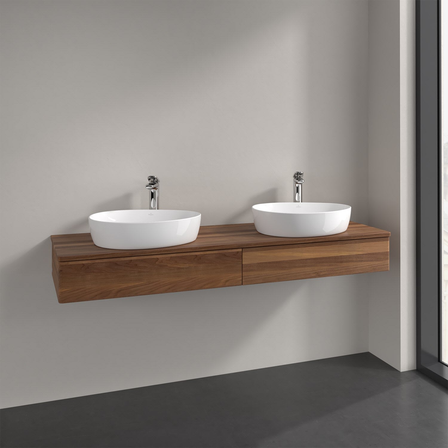 Der wandhängende Antao Waschtischunterschrank von Villeroy & Boch bietet nicht nur jede Menge Stauraum – er ist dank seines naturinspirierten Designs mit seinen abgerundeten Kanten auch noch besonders stilvoll und schafft eine gemütliche Atmosphäre im Badezimmer. Kombiniert mit zwei passenden Aufsatzwaschtischen also die ideale Wahl. Der geräumige Auszug bietet viel Platz, um alles Notwendige zu verstauen und Ordnung zu halten. Öffnen lässt er sich durch leichten Druck auf die grifflose Front. Dank Vollauszug hat man immer alles im Blick und der Antirutschboden verhindert ein Umfallen oder Verrutschen der Gegenstände. Einfach clever! Für eine besonders leichte Pflege sorgt die mehrschichtig deckend lackierte Oberfläche. Bei der Ausführung in Massivholz wird dank des verarbeiteten Massivholzes jedes Möbel zu einem Unikat, das sich durch das lebendige Naturmaterial durch seine einzigartige Struktur und Maserung auszeichnet.