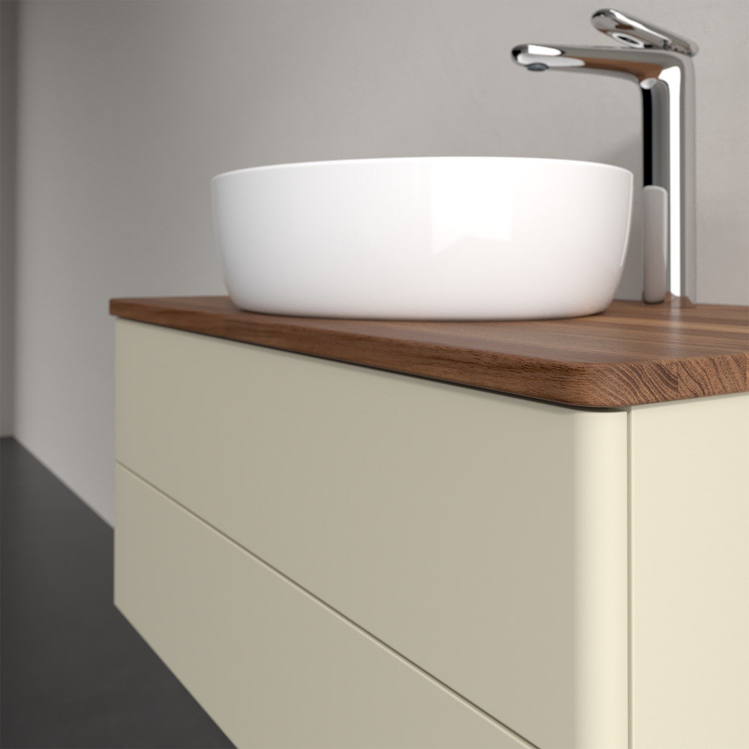 Mit dem wandhängenden Waschtischunterschrank der Kollektion Antao wird ein natürliches und gemütliches Flair am Waschplatz geschaffen. Dafür sorgen die sanfte Formsprache und die abgerundete Kanten des hochwertigen Badmöbels. Die wichtigsten Badutensilien für die tägliche Routine können seitlich des Waschtischs auf die Waschtischplatte gestellt werden. Ansonsten bieten zwei Auszüge inklusive Antirutschboden ausreichend Platz für weitere Produkte, die garantiert bleiben, wo sie hingehören. Der Unterschrank verfügt zudem über einen Vollauszug und Selbsteinzug mit SoftClosing Funktion, damit er bequem und mühelos geöffnet und geschlossen werden kann. Gewohnte Qualität von Villeroy & Boch! Für eine besonders leichte Pflege sorgt die mehrschichtig deckend lackierte Oberfläche. Bei der Ausführung in Massivholz wird dank des verarbeiteten Massivholzes jedes Möbel zu einem Unikat, das sich durch das lebendige Naturmaterial durch seine einzigartige Struktur und Maserung auszeichnet.