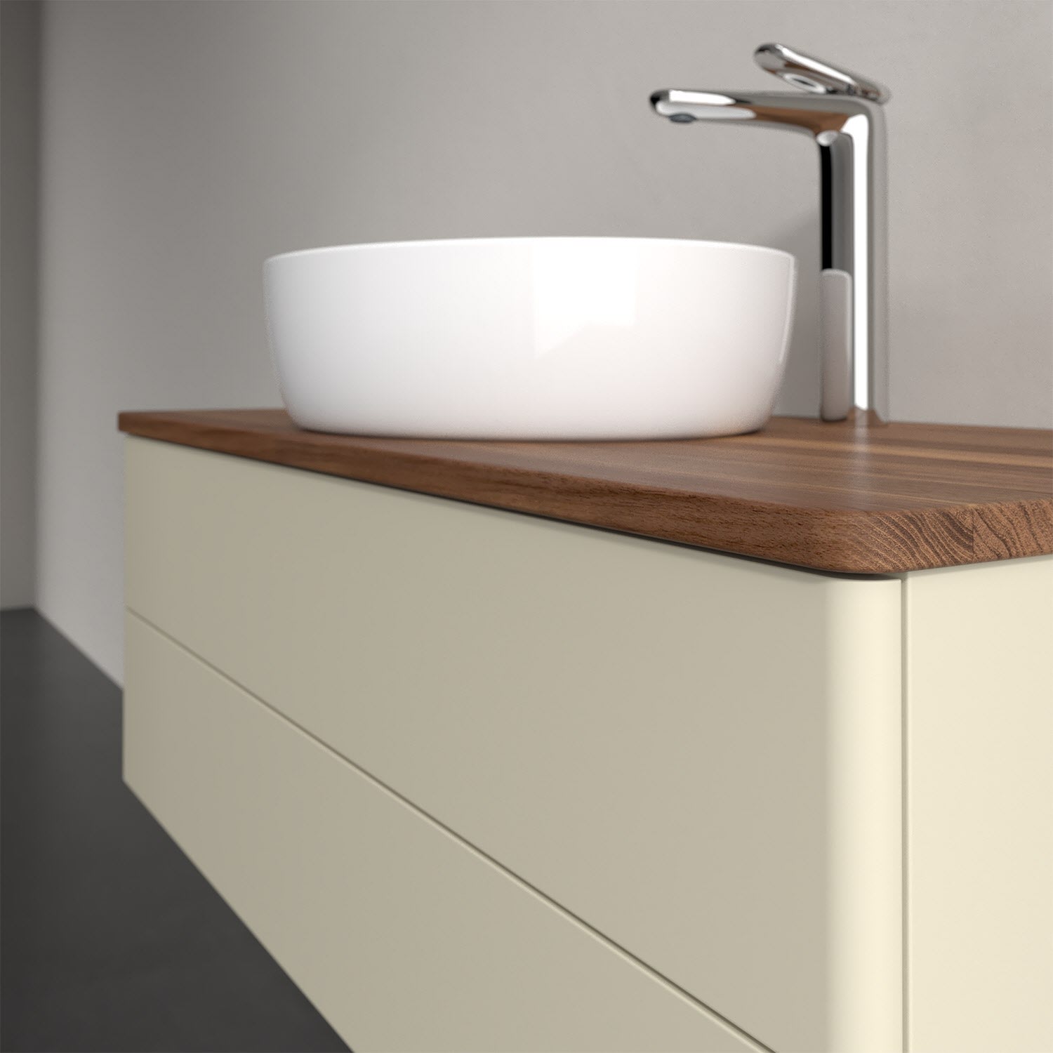 Für diesen Waschbeckenunterschrank stehen Ihnen Aufsatzwaschtische aus verschiedenen Serien zur Verfügung (siehe "Passliste" unter Downloads). Ein ausgewähltes Beispiel finden Sie im Zubehör. Den Waschtisch bitte separat mitbestellen.