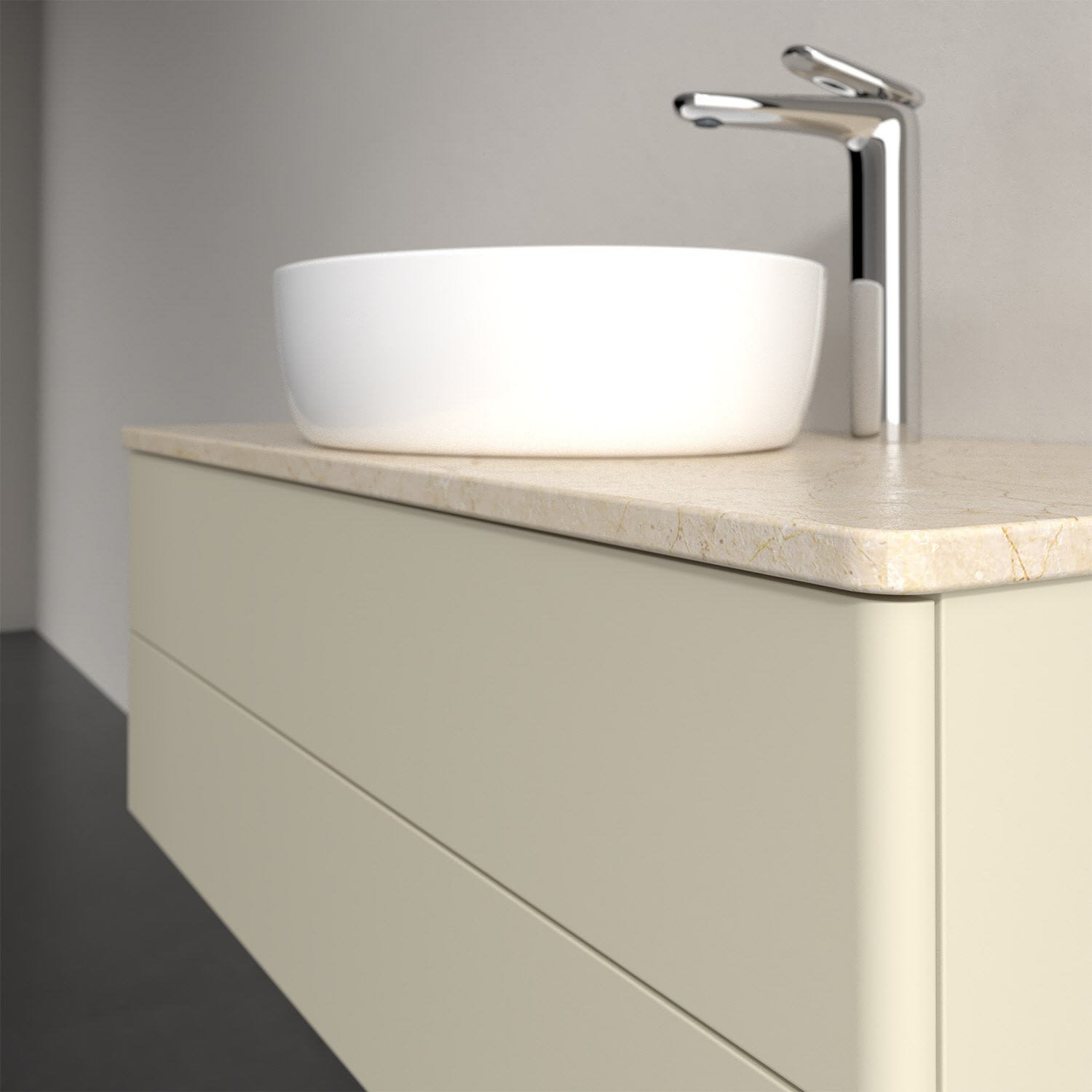 Für diesen Waschbeckenunterschrank stehen Ihnen Aufsatzwaschtische aus verschiedenen Serien zur Verfügung (siehe "Passliste" unter Downloads). Ein ausgewähltes Beispiel finden Sie im Zubehör. Den Waschtisch bitte separat mitbestellen.