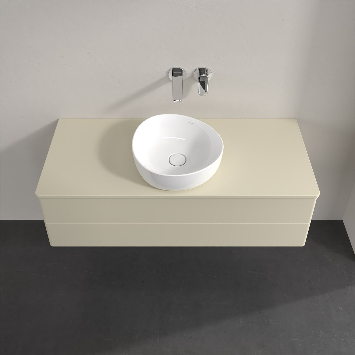 Für diesen Waschbeckenunterschrank stehen Ihnen Aufsatzwaschtische aus verschiedenen Serien zur Verfügung (siehe "Passliste" unter Downloads). Ein ausgewähltes Beispiel finden Sie im Zubehör. Den Waschtisch bitte separat mitbestellen.