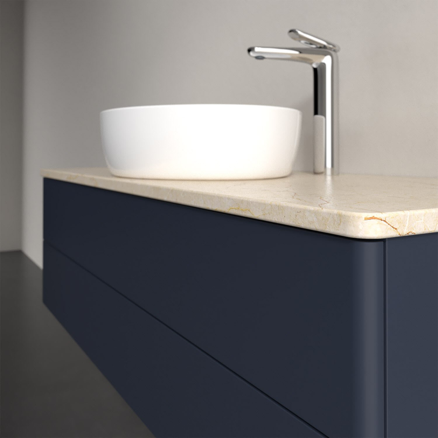 Der wandhängende Antao Waschtischunterschrank von Villeroy & Boch bietet nicht nur jede Menge Stauraum – er ist dank seines naturinspirierten Designs mit seinen abgerundeten Kanten auch noch besonders stilvoll und schafft eine gemütliche Atmosphäre im Badezimmer. Auf der Waschtischplatte bietet sich rechts und links neben dem Waschtisch viel Platz für Zahnbürstenbecher oder Seifenspender. Zwei geräumige Auszüge bieten viel Platz, um alles Notwendige zu verstauen und Ordnung zu halten. Öffnen lassen sie sich durch leichten Druck auf die grifflose Front. Dank Vollauszug hat man immer alles im Blick und der Antirutschboden verhindert ein Umfallen oder Verrutschen der Gegenstände. Einfach clever! Für eine besonders leichte Pflege sorgt die mehrschichtig deckend lackierte Oberfläche. Bei der Ausführung in Massivholz wird dank des verarbeiteten Massivholzes jedes Möbel zu einem Unikat, das sich durch das lebendige Naturmaterial durch seine einzigartige Struktur und Maserung auszeichnet.