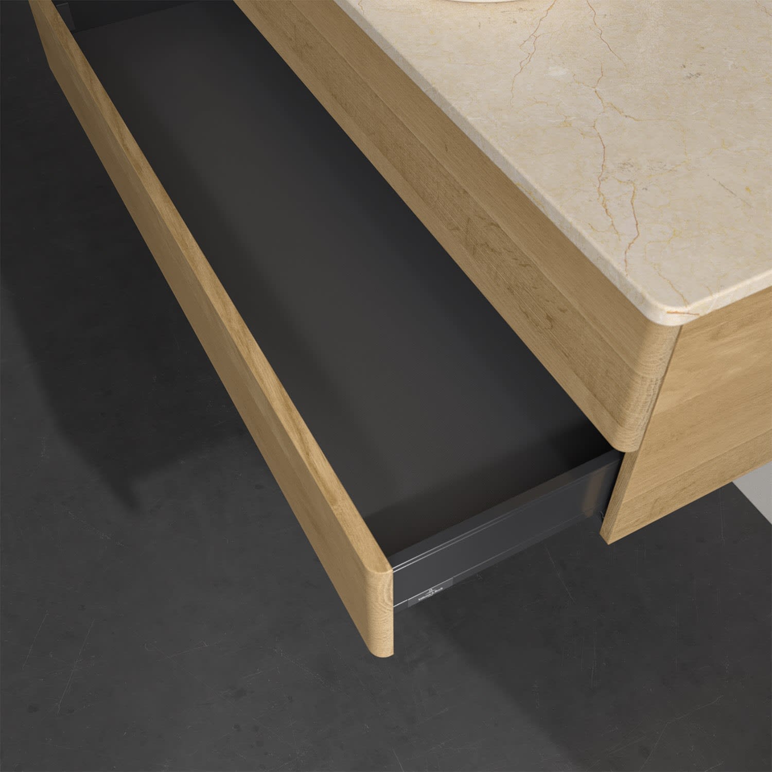Der wandhängende Antao Waschtischunterschrank von Villeroy & Boch bietet nicht nur jede Menge Stauraum – er ist dank seines naturinspirierten Designs mit seinen abgerundeten Kanten auch noch besonders stilvoll und schafft eine gemütliche Atmosphäre im Badezimmer. Auf der Waschtischplatte bietet sich rechts und links neben dem Waschtisch viel Platz für Zahnbürstenbecher oder Seifenspender. Zwei geräumige Auszüge bieten viel Platz, um alles Notwendige zu verstauen und Ordnung zu halten. Öffnen lassen sie sich durch leichten Druck auf die grifflose Front. Dank Vollauszug hat man immer alles im Blick und der Antirutschboden verhindert ein Umfallen oder Verrutschen der Gegenstände. Einfach clever! Für eine besonders leichte Pflege sorgt die mehrschichtig deckend lackierte Oberfläche. Bei der Ausführung in Massivholz wird dank des verarbeiteten Massivholzes jedes Möbel zu einem Unikat, das sich durch das lebendige Naturmaterial durch seine einzigartige Struktur und Maserung auszeichnet.