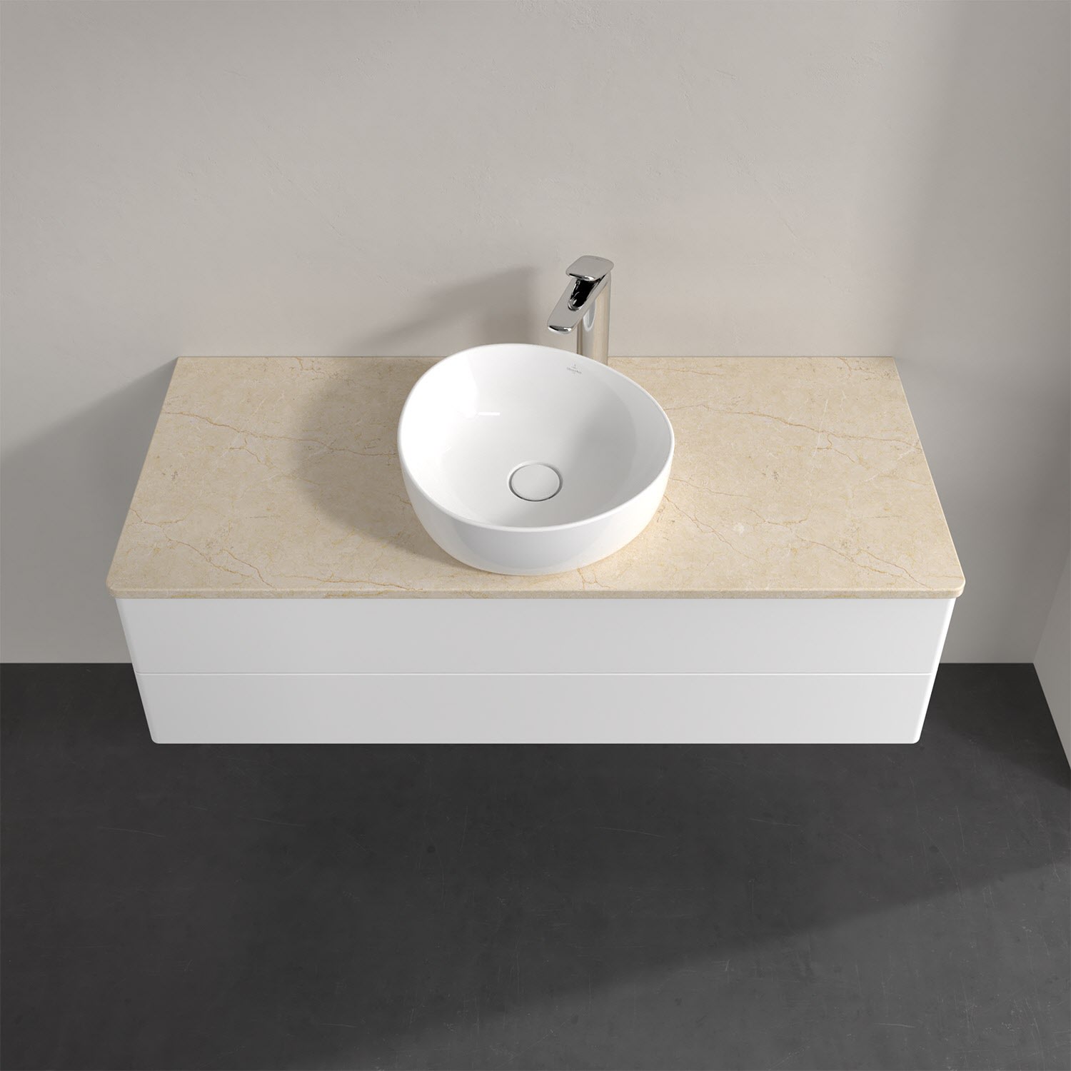 Für diesen Waschbeckenunterschrank stehen Ihnen Aufsatzwaschtische aus verschiedenen Serien zur Verfügung (siehe "Passliste" unter Downloads). Ein ausgewähltes Beispiel finden Sie im Zubehör. Den Waschtisch bitte separat mitbestellen.