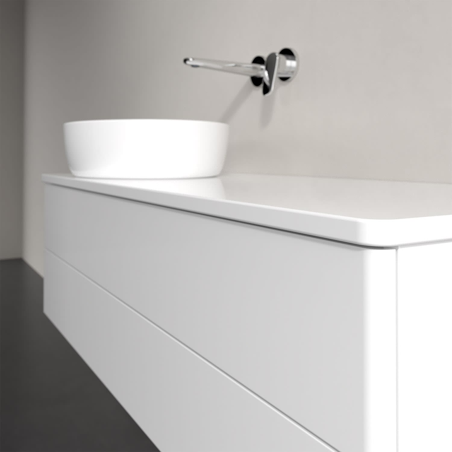 Der wandhängende Antao Waschtischunterschrank von Villeroy & Boch bietet nicht nur jede Menge Stauraum – er ist dank seines naturinspirierten Designs mit seinen abgerundeten Kanten auch noch besonders stilvoll und schafft eine gemütliche Atmosphäre im Badezimmer. Auf der Waschtischplatte bietet sich seitlich des Waschtischs viel Platz für Zahnbürstenbecher oder Seifenspender. Zwei geräumige Auszüge bieten viel Platz, um alles Notwendige zu verstauen und Ordnung zu halten. Öffnen lassen sie sich durch leichten Druck auf die grifflose Front. Dank Vollauszug hat man immer alles im Blick und der Antirutschboden verhindert ein Umfallen oder Verrutschen der Gegenstände. Einfach clever! Für eine besonders leichte Pflege sorgt die mehrschichtig deckend lackierte Oberfläche.
