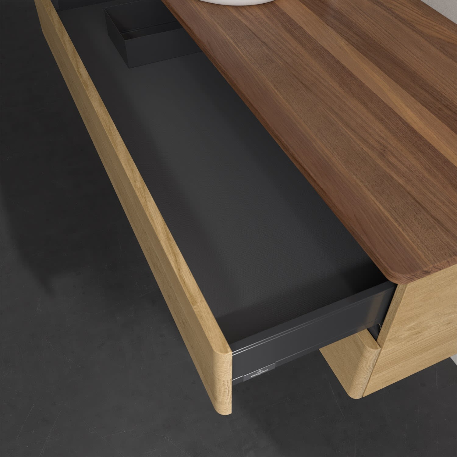 Der wandhängende Antao Waschtischunterschrank von Villeroy & Boch bietet nicht nur jede Menge Stauraum – er ist dank seines naturinspirierten Designs mit seinen abgerundeten Kanten auch noch besonders stilvoll und schafft eine gemütliche Atmosphäre im Badezimmer. Auf der Waschtischplatte bietet sich seitlich des Waschtischs viel Platz für Zahnbürstenbecher oder Seifenspender. Zwei geräumige Auszüge bieten viel Platz, um alles Notwendige zu verstauen und Ordnung zu halten. Öffnen lassen sie sich durch leichten Druck auf die grifflose Front. Dank Vollauszug hat man immer alles im Blick und der Antirutschboden verhindert ein Umfallen oder Verrutschen der Gegenstände. Einfach clever! Für eine besonders leichte Pflege sorgt die mehrschichtig deckend lackierte Oberfläche. Bei der Ausführung in Massivholz wird dank des verarbeiteten Massivholzes jedes Möbel zu einem Unikat, das sich durch das lebendige Naturmaterial durch seine einzigartige Struktur und Maserung auszeichnet.